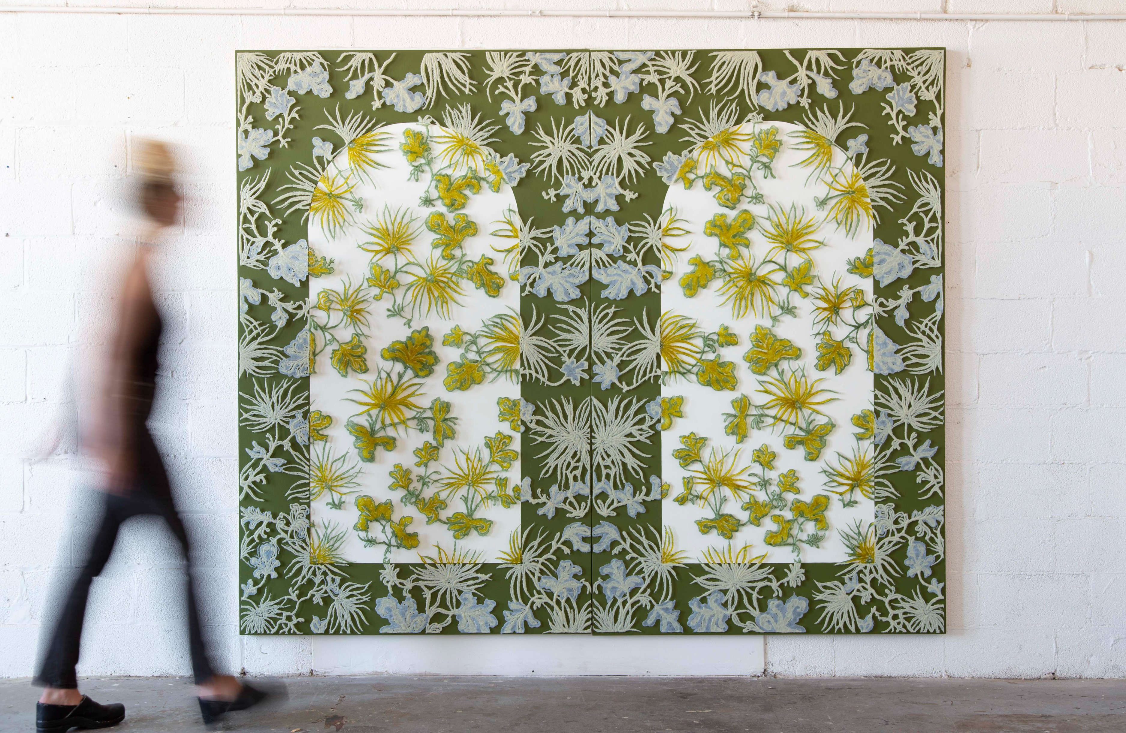 Heartland 5 Opens April 7 | | Kate Clements, Verdant, 2023. Kiln fired glass on painted panel. 100 x 83 in. Photo courtesy of the artist. | Heartland 5 is a juried exhibition of the Midwest region’s finest glass art, now in its fifth year. The exhibition opens with two nights of programming at two Belger Arts locations: