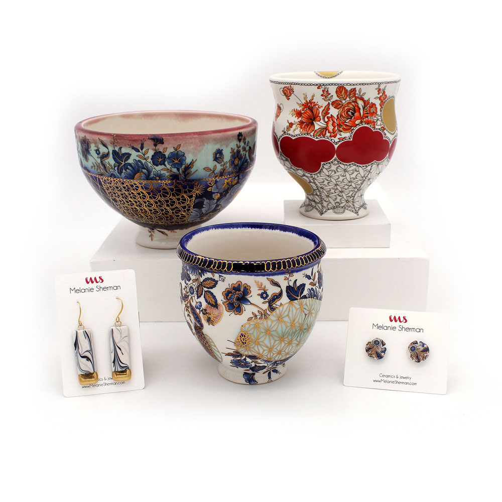 | Top to bottom: Melanie Sherman, Bowl, 2020, Porcelain, 4 x 5.75 x 5.75 in., Cup, 2020, Porcelain, 4.25 x 4.25 x 4.25 in., Dangles, 2020, Porcelain, 2 x 0.5 in., Cup, 2020, Porcelain, 3.75 x 3.75 x 3.75 in., and Studs, 2020, Porcelain, Gold Plated Sterling Silver, 0.5 x 0.5 in. |