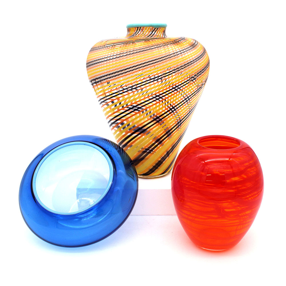 | Left to right: Scott Fouche, Blue Bowl, Glass, 3.75 x 7.5 x 7.5 in., Inciso Fall Vase, Glass, 11 x 8.5 x 8.5 in., and Sunset Vase, Glass, 6.5 x 5.25 x 5.25 in. |