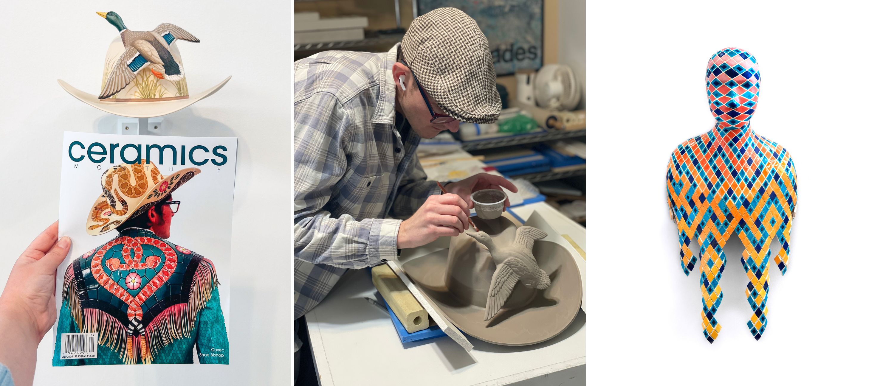 Shae Bishop, whose 2011 piece â˘â˘â˘â˘â˘ (right) from the Belger Collection and new ceramic hats (left) are featured in Second Skin: Exploring Adornment as an Extension of Self, earned his BFA from the Kansas City Art Institute in 2012 and was a Resident Artist at Belger Arts from 2012 to 2014. His work has been exhibited worldwide, and heâs participated in residencies at Kohler Arts, the Archie Bray Foundation, San Diego State University, University of Wisconsin, and others. In December 2025, he was recognized by My Modern Met as one of the Ceramic Artists Who Are Shaping the Future of Clay, and his work is featured in Ceramics Monthly's April 2026 issue. Bishopâs art explores the relationship between ceramic materials and the adaptability required for wearable garments. He explains that his pieces draw âconnections between diverse craft traditions, cultures, and my personal history. I create wearable portraits, building stories around the body.â