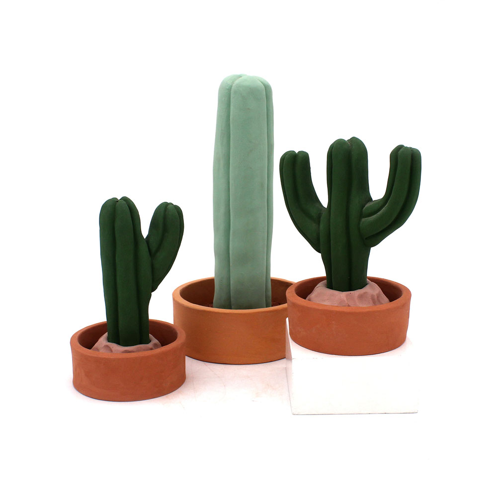 | Left to right: Christina Erives, small cactus, 2016, Earthenware, 2.5 x 6 in., cactus, Earthenware, 8.5 x 4.5 in., small cactus, 2016, Earthenware, 2.5 x 6 in. | | Top to bottom: Christina Erives, Figure Plate, 2016, Earthenware, 7 x 7 in.; La Luz, 2017, Earthenware, 4 x 4 in.; Planter, 2017, Earthenware, Bowl: 3.5 x 6 in, Plate: 0.5 x 6.5 in.; Tostada Plate, 2017, Earthenware, 0.5 x 5.5 in.; Small Cactus, 2016, Earthenware, 2.5 x 6 in. |