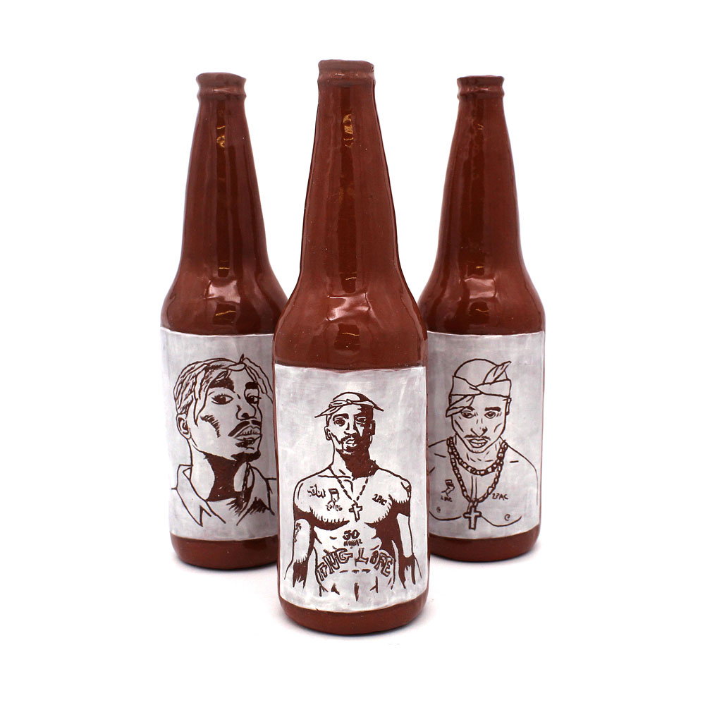 | Christina Erives, planter, 2017, Earthenware, Bowl: 3 x 5.5 in., Plate: 0.5 x 6.5 in. | | Christina Erives, 2 pac bottles, 2017, Earthenware, 10.5 x 3 in. |