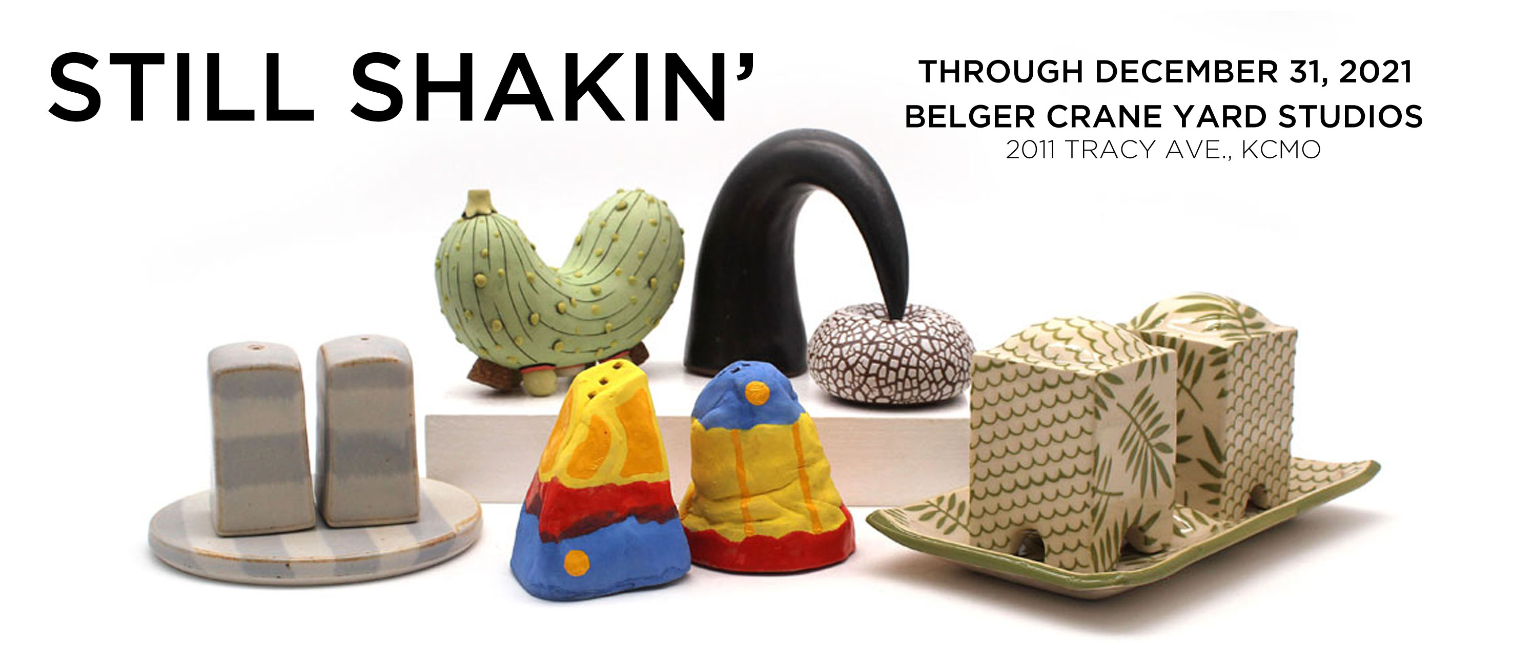 Back to front, left to right: Casey Taylor, Pickle Shaker, 2021, porcelain and colored clay, 3.75 x 4.75 x 2 in., Al Holen, Point of View S&P, 2021, dark stoneware, glaze, cone 10, 4.5 x 6 x 2.5 in., Courtney Michaud, Prairie S&P Shakers and Coaster, 2021, porcelain, cone 10 oxidation, 4 x 5 x 5 in., Jamin Shepherd, Salt and Pepper Shaker 2, 2021, ceramic, underglaze, glaze, and overglaze, 2.5 x 2.5 x 3 in. each, and Mandy Henebry, Green Palm, 2021, Ceramic, 4.25 x 8.25 x 4 in.