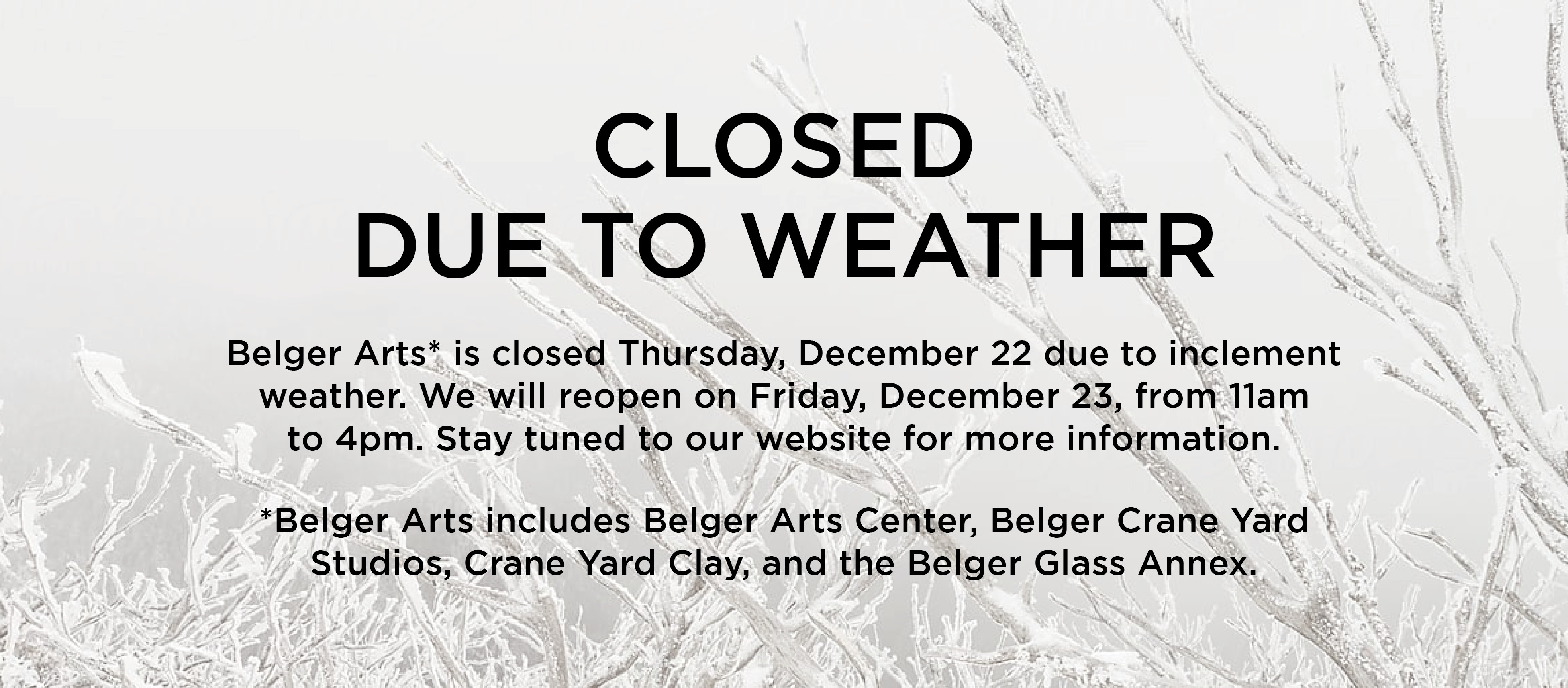 All Belger Arts locations will be closed December 24 through 26 and December 31 through January 2. Our hours for December 27 through 30 are 10 am to 2 pm, except for the Belger Arts Center (2100 Walnut St.), which is closed on Tuesdays. Happy holidays! |