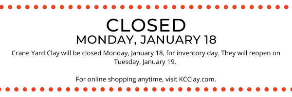All equipment on the Crane Yard Clay website is 10% off this month! This includes kilns, wheels, 3-D printers, slab rollers, and puggers. February's online sale will be on all stocked clay!