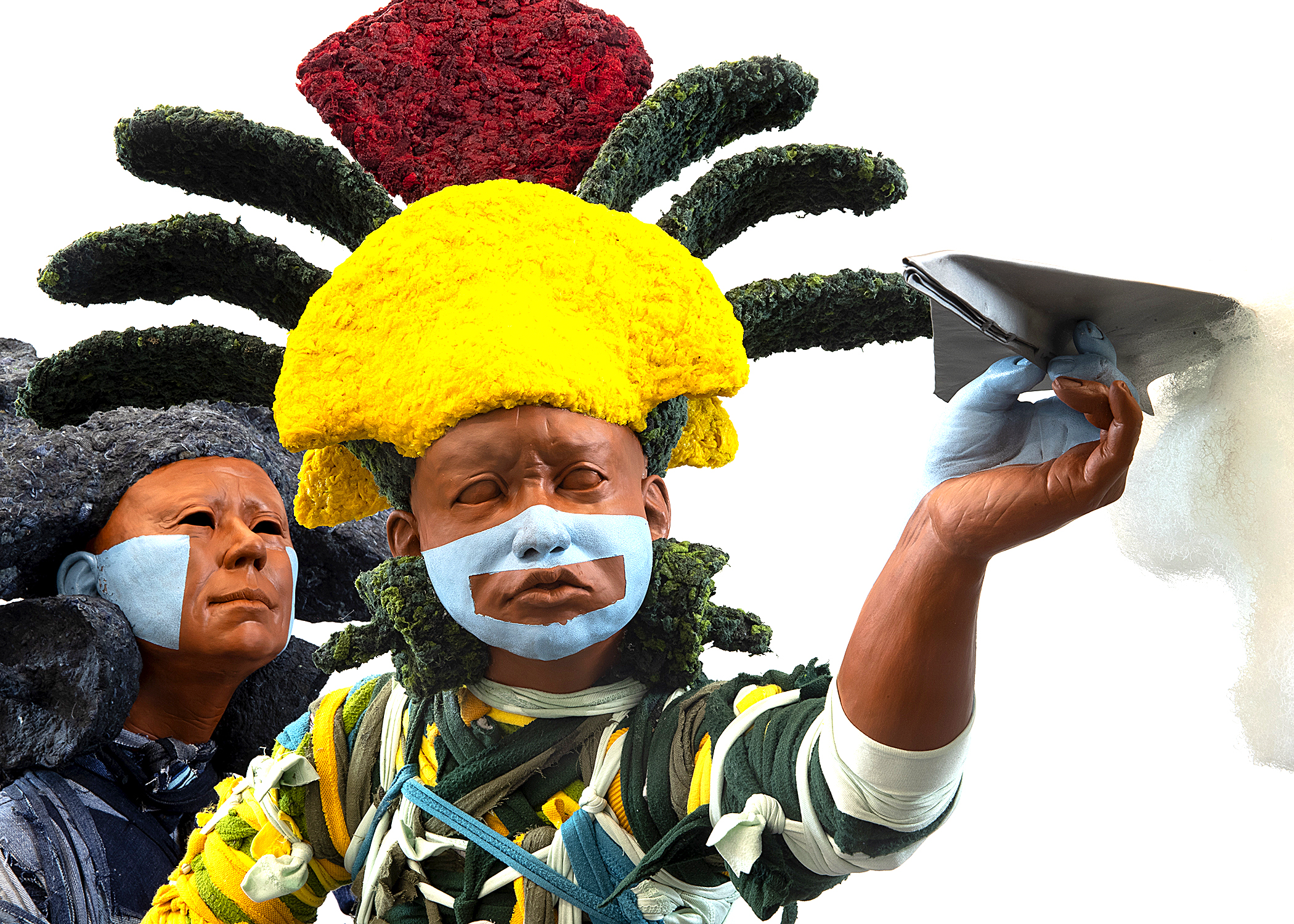 Christensen Caballero uses a number of materials to create his life-sized sculptures, including red earthenware, recycled fibers, and fabrics, readymade objects, building materials, indigo, metal, and wood. His choice of materials is deliberate and layered with meaning and history. The red earthenware faces begin as life castings of people in the artist’s life. The indigo and denim used in the construction of his figures reference the history of labor. The reused tablecloths, bedsheets, and work tools that clothe and adorn these figures relate to specific objects that laborers work with today. Additionally, the iconography and artist’s choice of color palette acknowledge the pre-colonized art of the Americas.