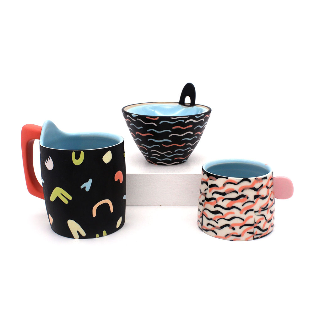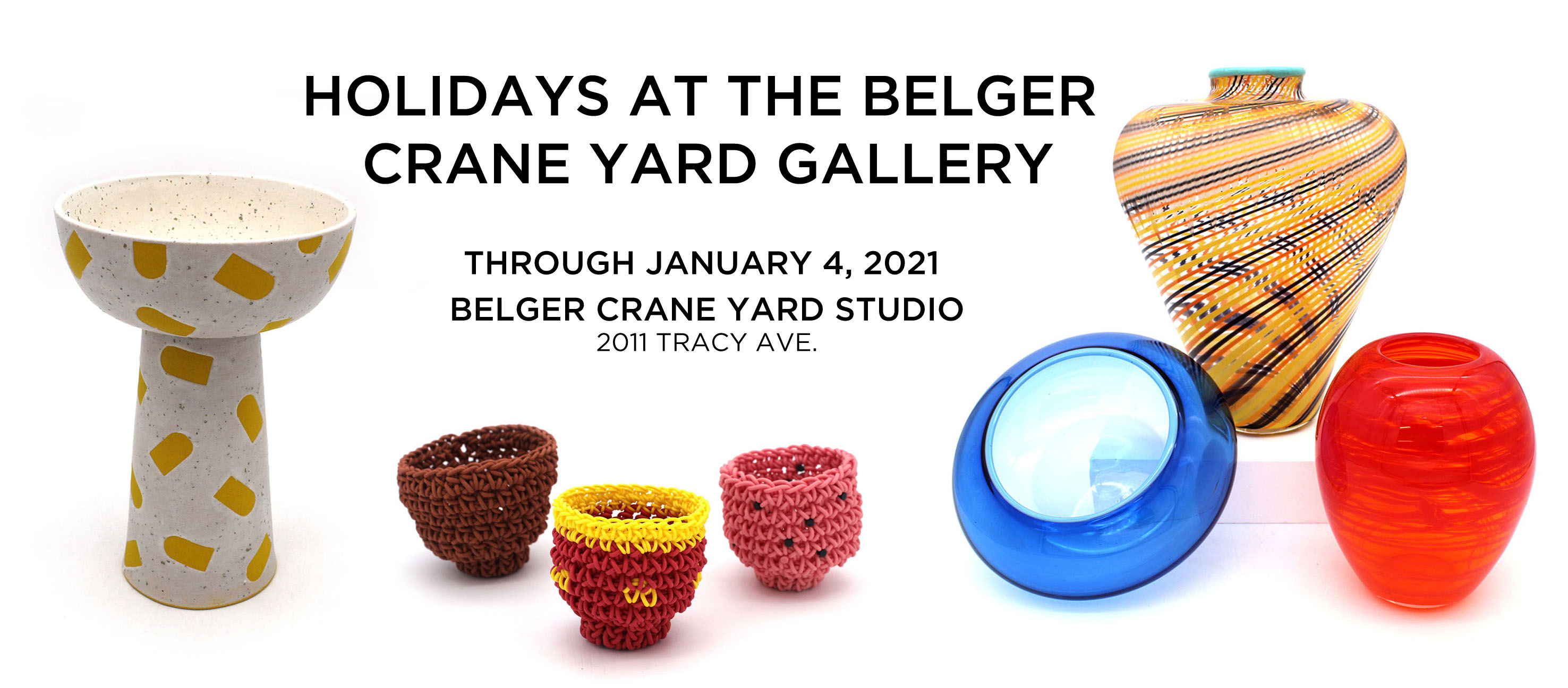 Left to right: Del Norte Studio, Moonstone Vase with Yellow Accents, 2020, Stoneware ceramic, 9.5 in., Jeremy R. Brooks, Brown Knot Pot, 2018, Terracotta, 3 x 3 x 3 in., Jeremy R. Brooks, Red and Yellow Knot Pot, 2018, Colored porcelain, 3 x 3 x 3 in., Jeremy R. Brooks, Pink Knot Pot, 2018, Colored porcelain, 3 x 3 x 3 in., Scott Fouché, Blue Bowl, Glass, 3.75 x 7.5 x 7.5 in., Scott Fouché, Inciso Fall Vase, Glass, 11 x 8.5 x 8.5 in., and Scott Fouché, Sunset Vase, Glass, 6.5 x 5.25 x 5.25 in.