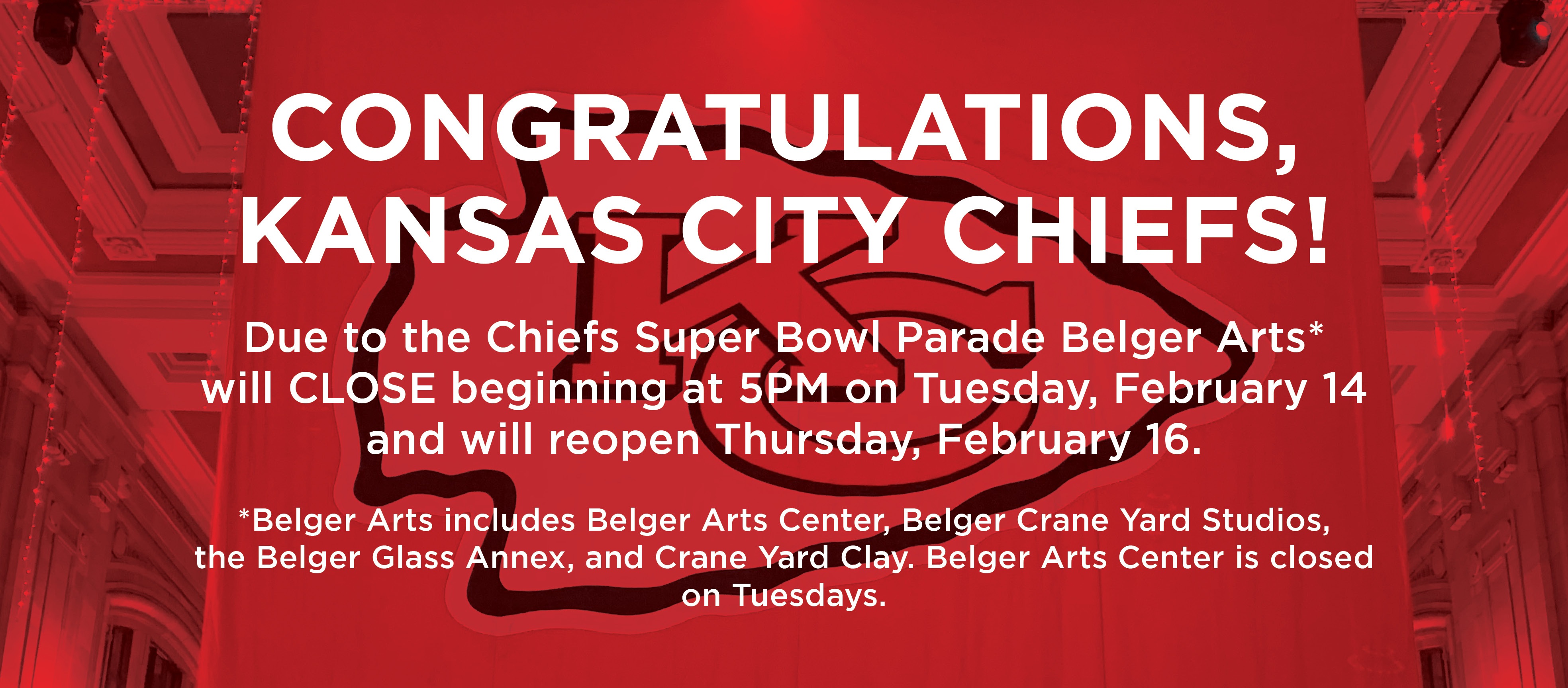 Due to updated street closures near the Chiefs parade route, Belger Arts will close beginning Tuesday, February 14 at 5PM. Classes on the evening of Tuesday, February 14, and on Wednesday, February 15 will not be held. All locations will reopen on Thursday, February 16. Belger Arts includes: Belger Arts Center (2100 Walnut St., KCMO), Belger Crane Yard Studios (2011 Tracy Ave., KCMO), the Belger Glass Annex (1219 E. 19th St., KCMO), and Crane Yard Clay (2011 Tracy Ave., KCMO). Belger Arts Center is not open on Tuesdays. |