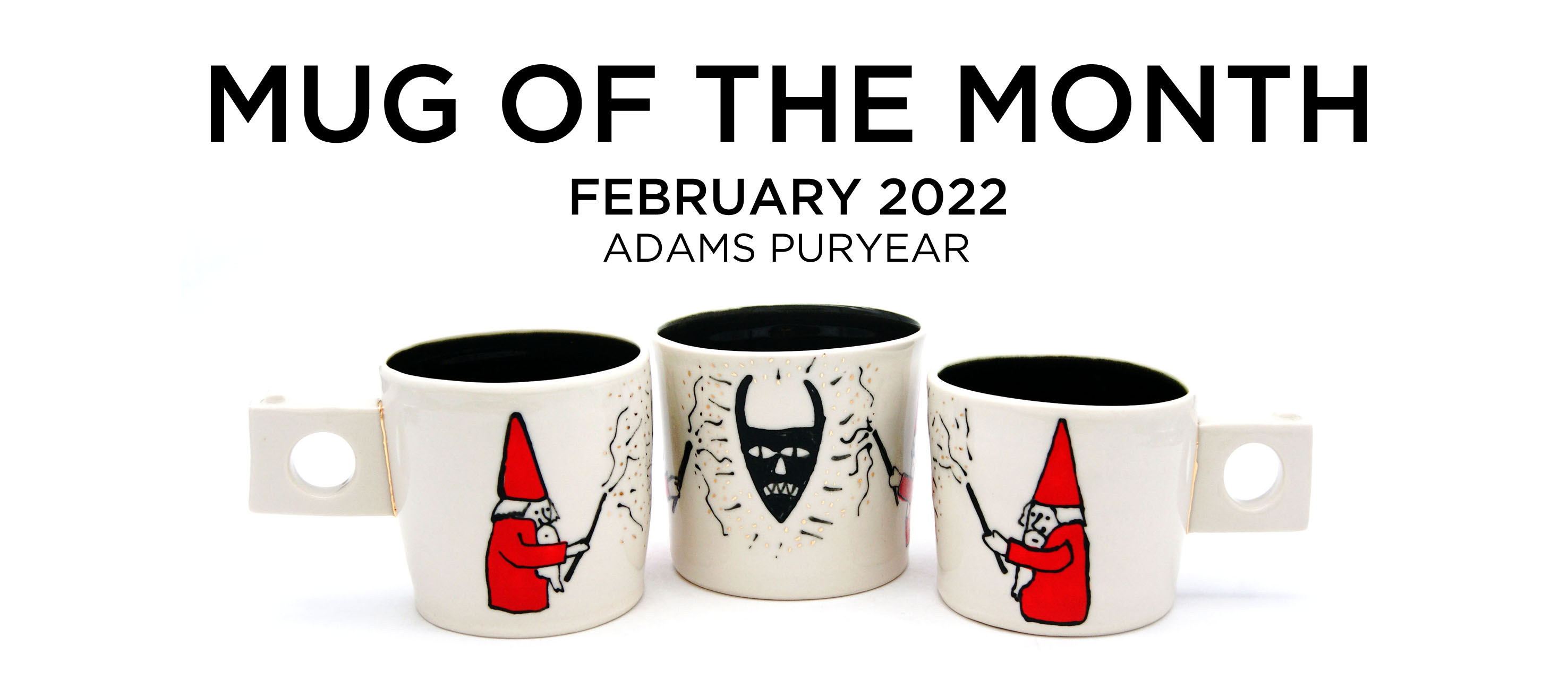 February's Mug of the Month artist is resident artist Adams Puryear whose mugs are the perfect blend of sleek design and whimsey. The geometric handles have a pop of gold luster, and the imagery is a mix of hand-drawn bunnies, snakes, and wizards. These mugs will be available online and in the gallery starting Tuesday, February 1 at 10 am CST. Learn more about Adams by visiting his artist page.