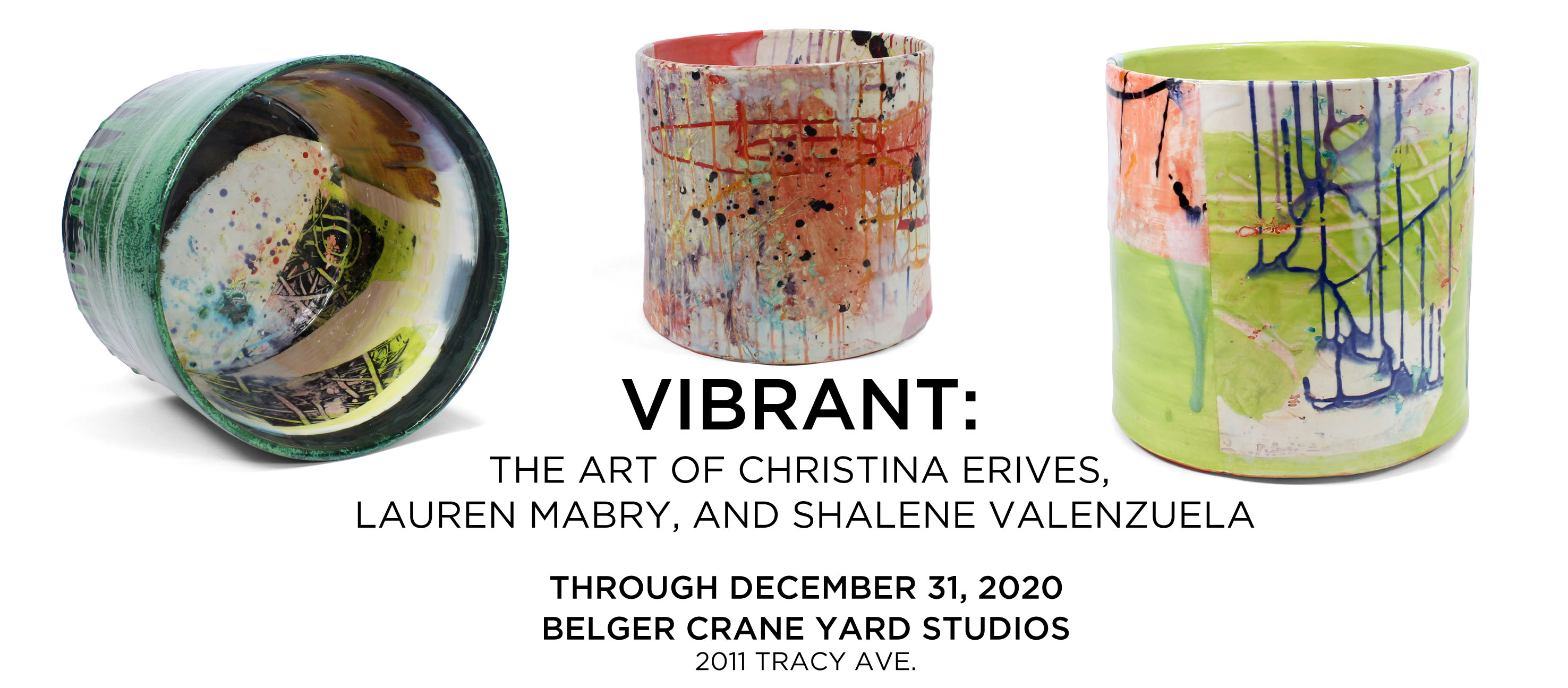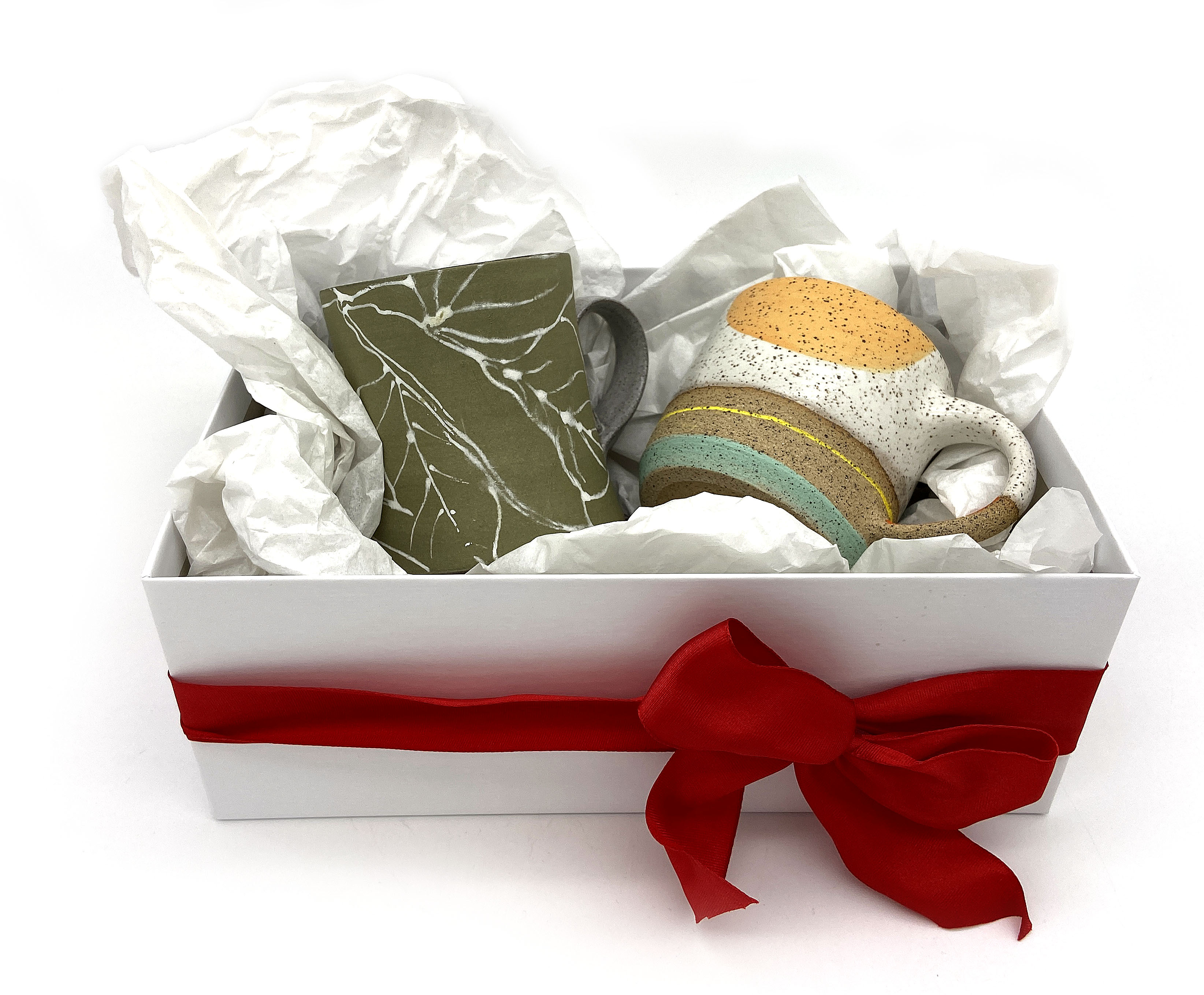 Left to right: Del Norte Studio, Moonstone Vase with Yellow Accents, 2020, Stoneware ceramic, 9.5 in., Jeremy R. Brooks, Brown Knot Pot, 2018, Terracotta, 3 x 3 x 3 in., Jeremy R. Brooks, Red and Yellow Knot Pot, 2018, Colored porcelain, 3 x 3 x 3 in., Jeremy R. Brooks, Pink Knot Pot, 2018, Colored porcelain, 3 x 3 x 3 in., Scott Fouché, Blue Bowl, Glass, 3.75 x 7.5 x 7.5 in., Scott Fouché, Inciso Fall Vase, Glass, 11 x 8.5 x 8.5 in., and Scott Fouché, Sunset Vase, Glass, 6.5 x 5.25 x 5.25 in.