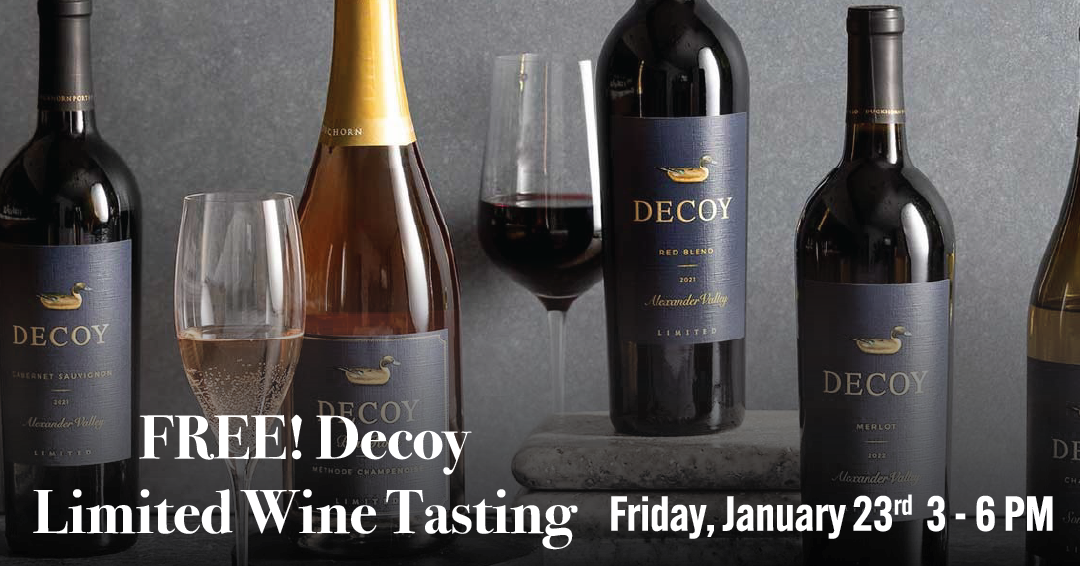 Free Decoy Limited Wine Tasting Taste the pinnacle of Decoy winemaking—Decoy Limited wines crafted from acclaimed California vineyard sources across Alexander Valley, Napa Valley, and the Sonoma Coast. Come sip something special! |