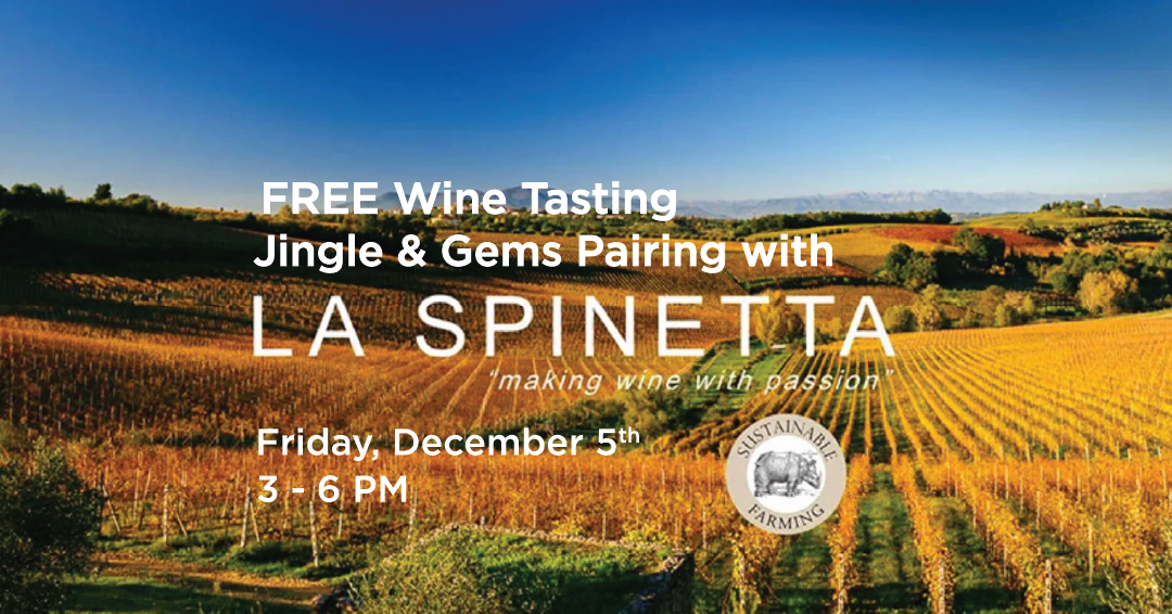 Join us in-store for a free “Jingle & Gems” holiday tasting featuring four acclaimed La Spinetta wines—Moscato d’Asti, Il Rosé di Casanova, Il Nero di Casanova, and Ca’ di Pian Barbera d’Asti—each paired with festive small bites. Celebrate the season with elegant, highly rated wines and perfectly matched holiday treats. |
