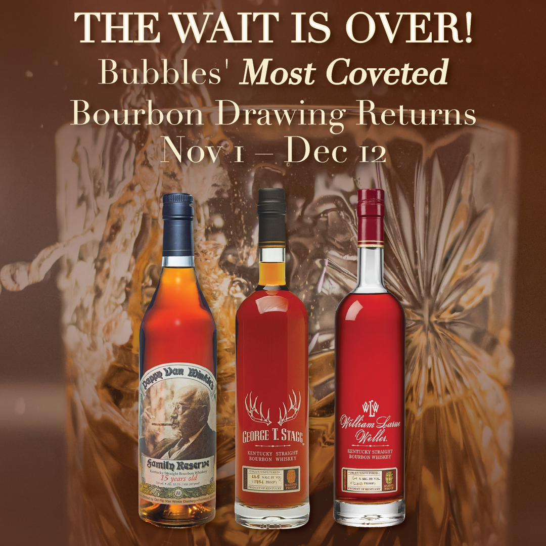 ONLY 8 DAYS LEFT TO ENTER Back for 2025: Bubbles’ Most Coveted Bourbon Drop Bourbon unicorns are back at Bubbles. We’re running our annual drawing for Pappy Van Winkle, the Buffalo Trace Antique Collection, and other highly allocated whiskies. How it works • Enter in store ONLY: Nov 1 – Dec 12. • Drawing #1: Dec 13 – selected entrants get the opportunity to purchase their bottle; winners will be notified during the week.