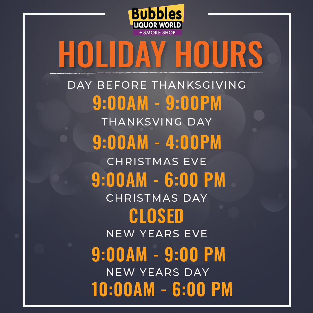 Stop by today, stock up on A to Z and Erath wines, and enter to win! | | | Josh Wines and Bubbles Liquor World are teaming up to bring you the ultimate fall giveaway — a MiniMax Big Green Egg Package This all-in-one grill, smoker, BBQ, and brick oven is your ticket to cozy nights and delicious fireside meals. Compact, portable, and built to perform, the MiniMax is perfect for camping, tailgating, Enter in-store now through November 30th for your chance to win this amazing setup — complete with charcoal, tools, and a lifetime warranty! * Grab your favorite Josh Wines. * Enter the giveaway. * Make this fall one to remember. | | | The holidays are almost here — and we’ve got tons of promotions, fun events, tastings, and special pricing coming your way! Be among the first to know by following us on Facebook — don’t miss out on all the festive fun! | We’re adjusting our hours for the holidays — stop by early and enjoy the season with us! | | |