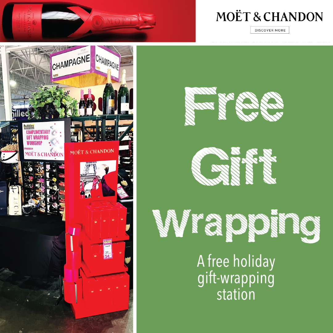 A free holiday gift-wrapping station—courtesy of our good friends at Moët & Chandon—is now set up at Bubbles! Even better, the complimentary wrapping is available for any product purchased in-store, not just Moët. Swing by, shop your favorites, and leave with beautifully wrapped gifts—on us and Moët. |