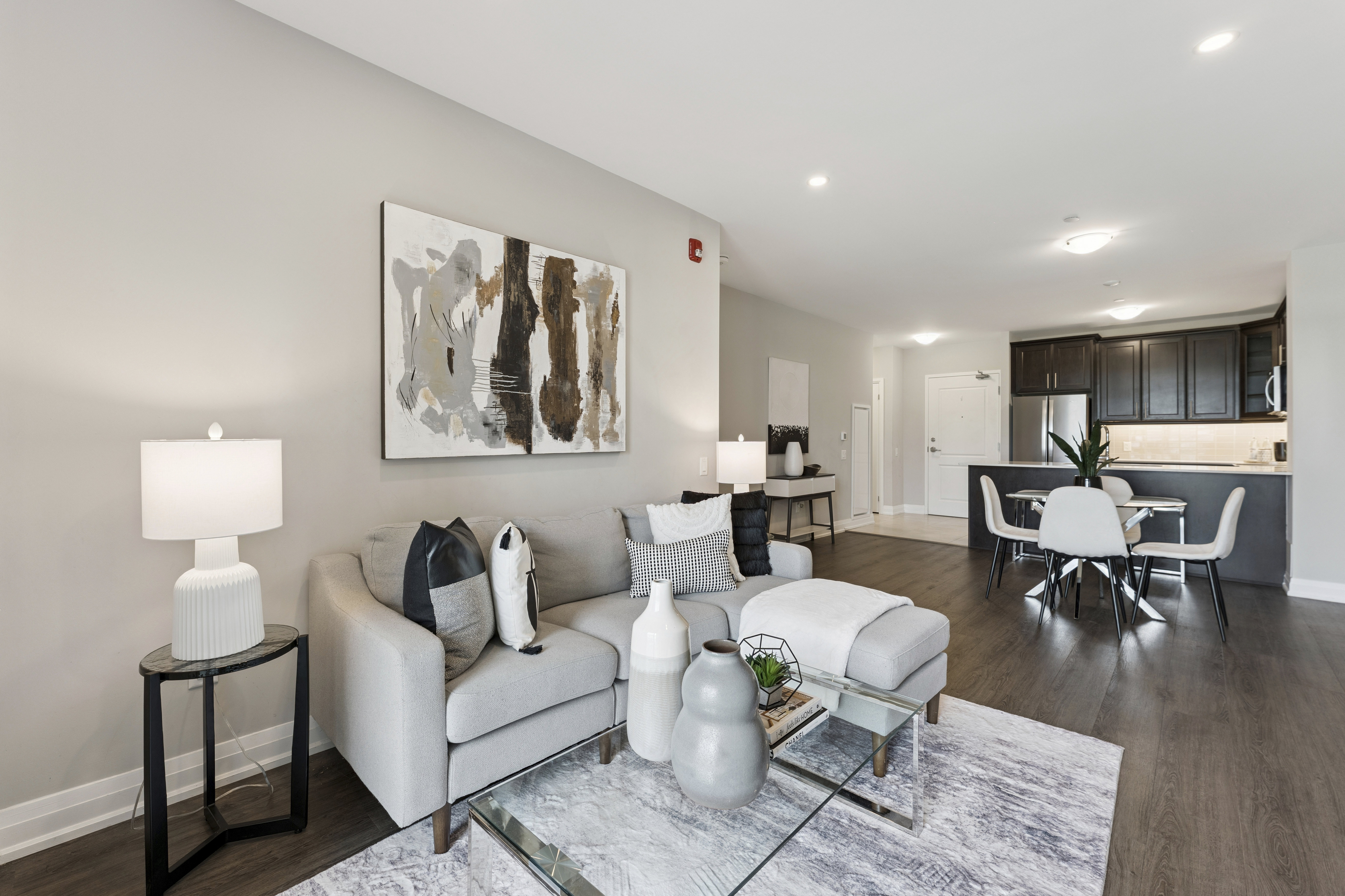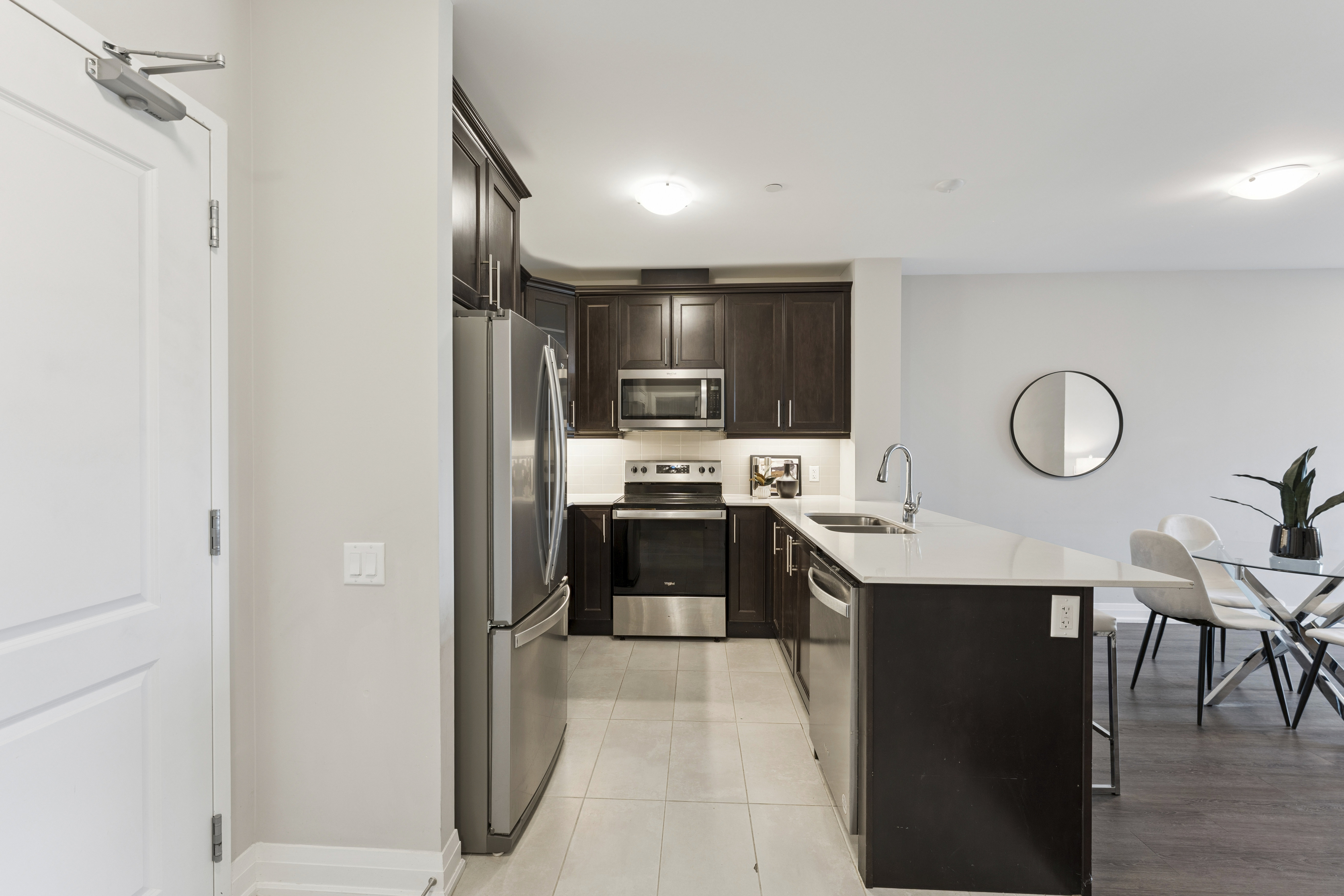 ✔ Upgraded kitchen with quartz counters, S/S appliances, backsplash, breakfast bar, pot lights, valence lighting & glass cabinet insert