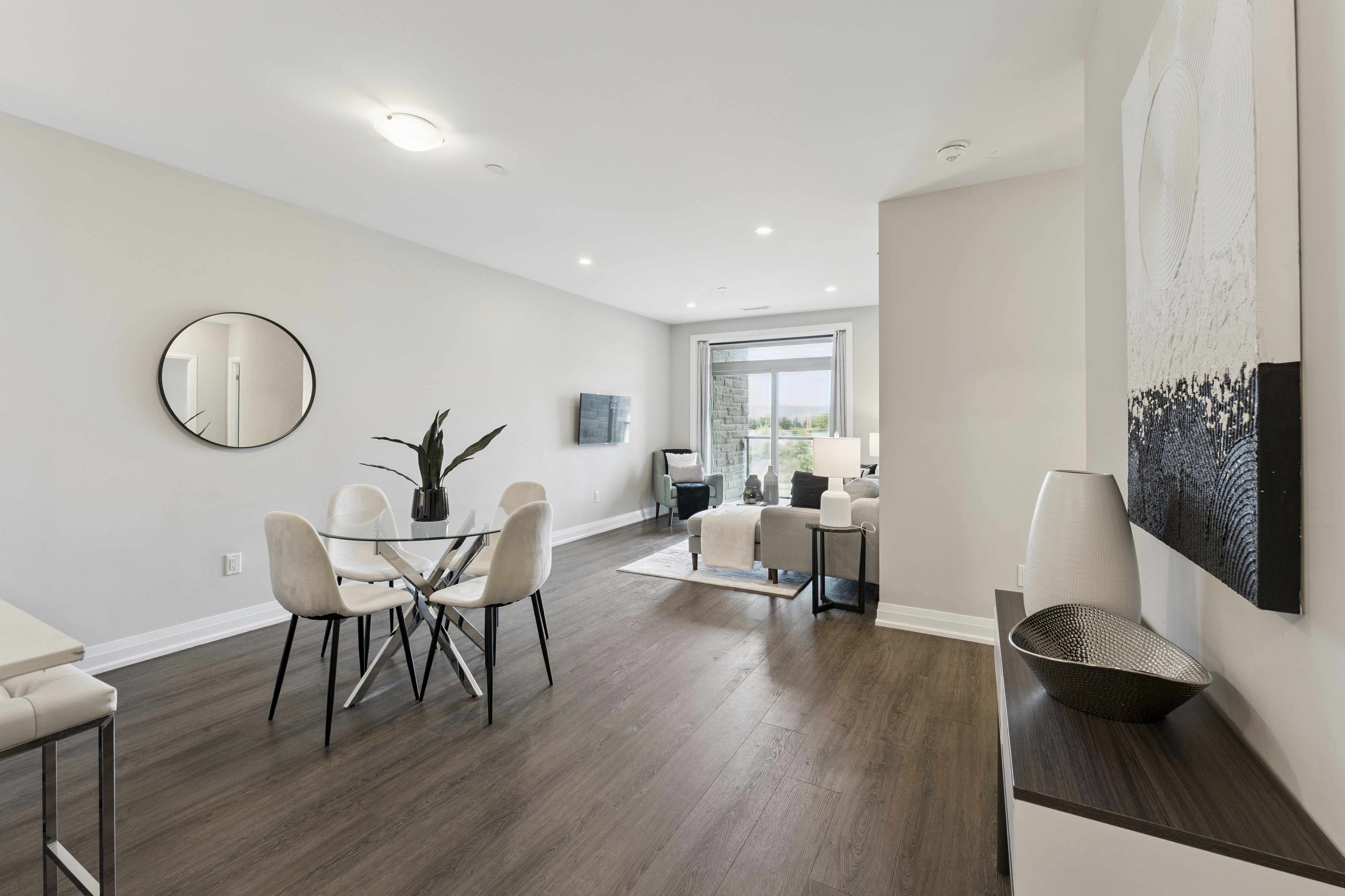 This spacious “Pine” model features 1,153 sq. ft. + 55 sq. ft. balcony, 9 ft. ceilings, and hardwood floors throughout. Open-concept layout with sun-filled living & dining area, large windows, and beautiful Escarpment views.