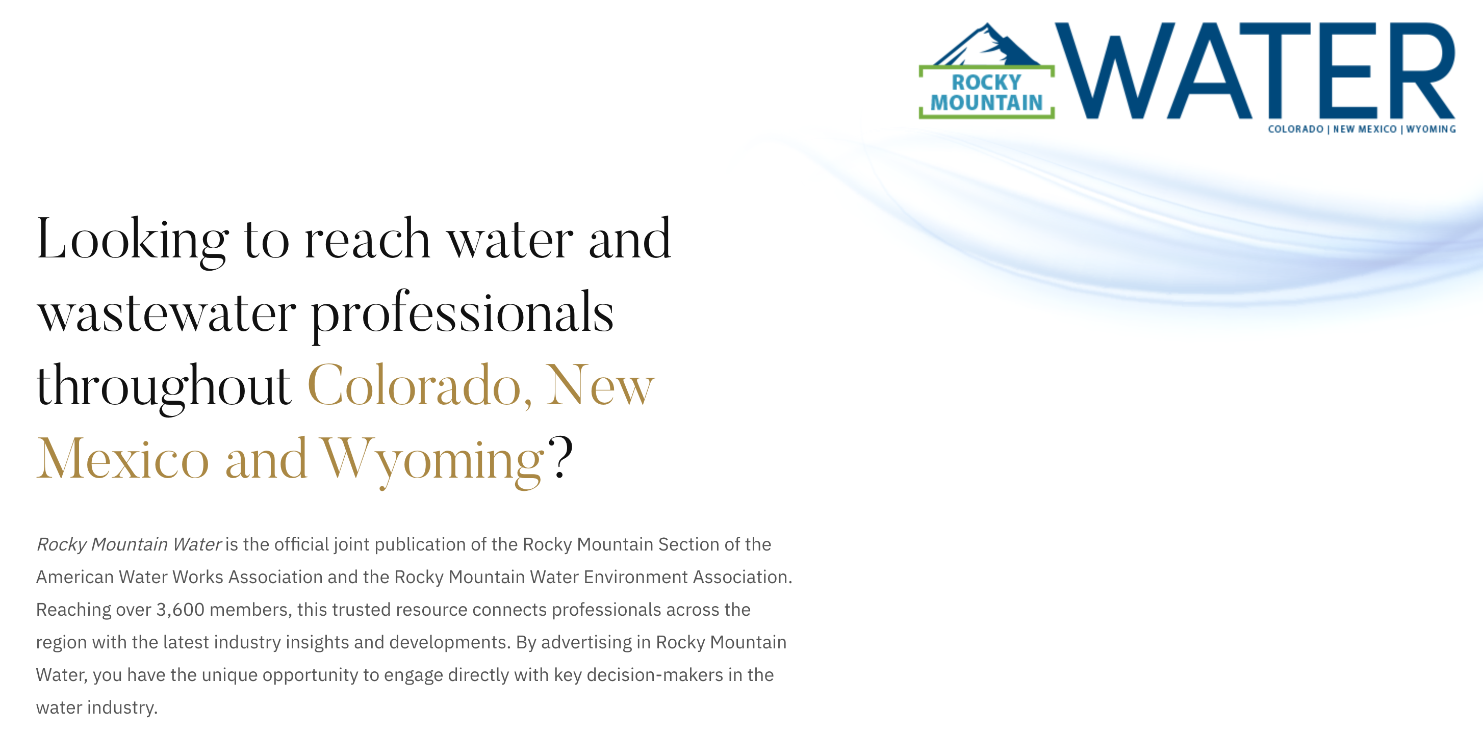 Reaching over 3,600 members, Rocky Mountain Water is a trusted resource connecting water professionals across Colorado, New Mexico, and Wyoming with the latest industry insights and developments. By advertising in Rocky Mountain Water, you have the unique opportunity to engage directly with key decision-makers in the water industry, including utilities, engineers, and policy markers. Learn more about advertising opportunities here and check out the magazine's latest edition here.