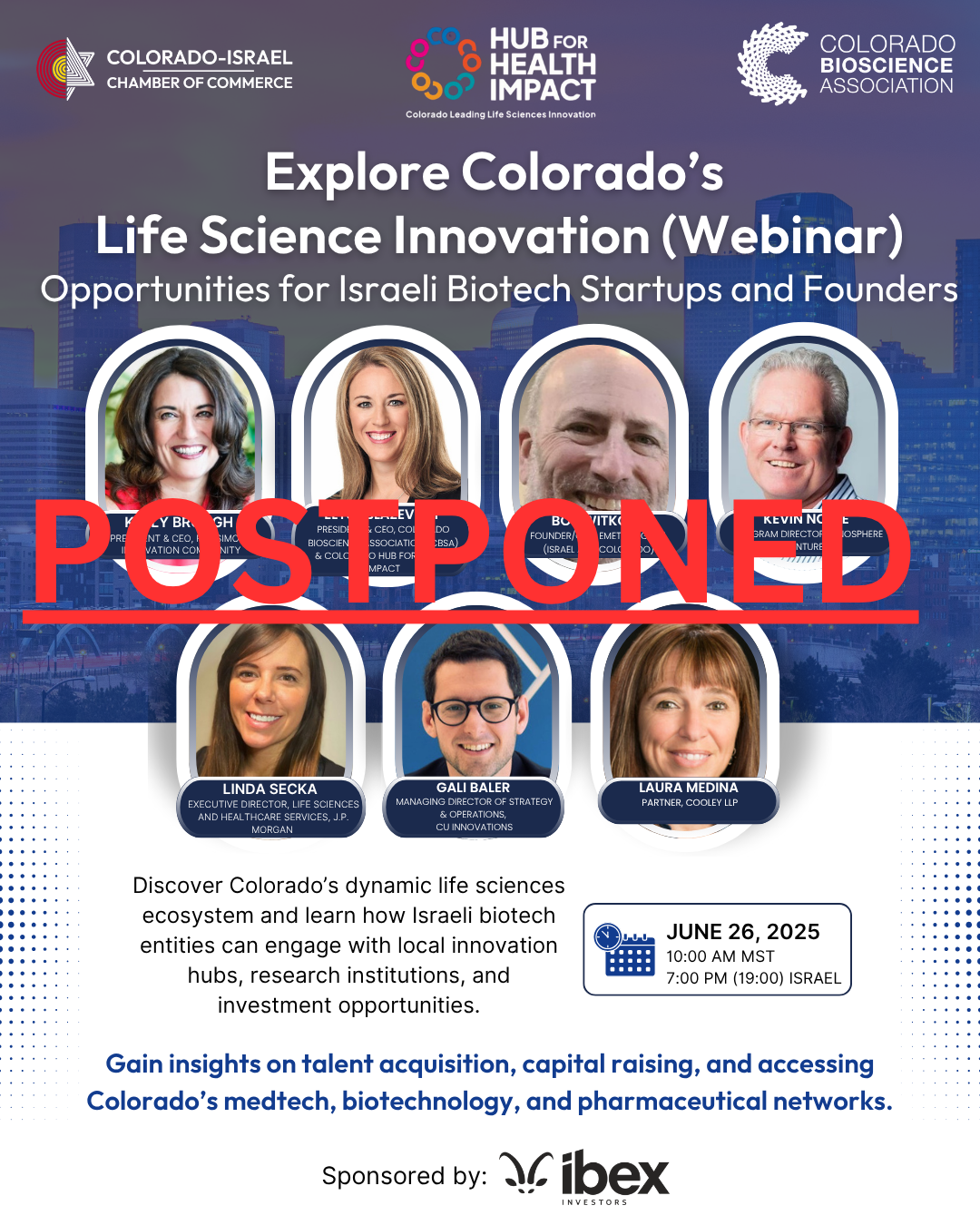 Due to the situation in Israel, we have decided to postpone and reschedule our planned June 26 Colorado life sciences webinar for Israeli biotech companies. Stay tuned for the new date!
