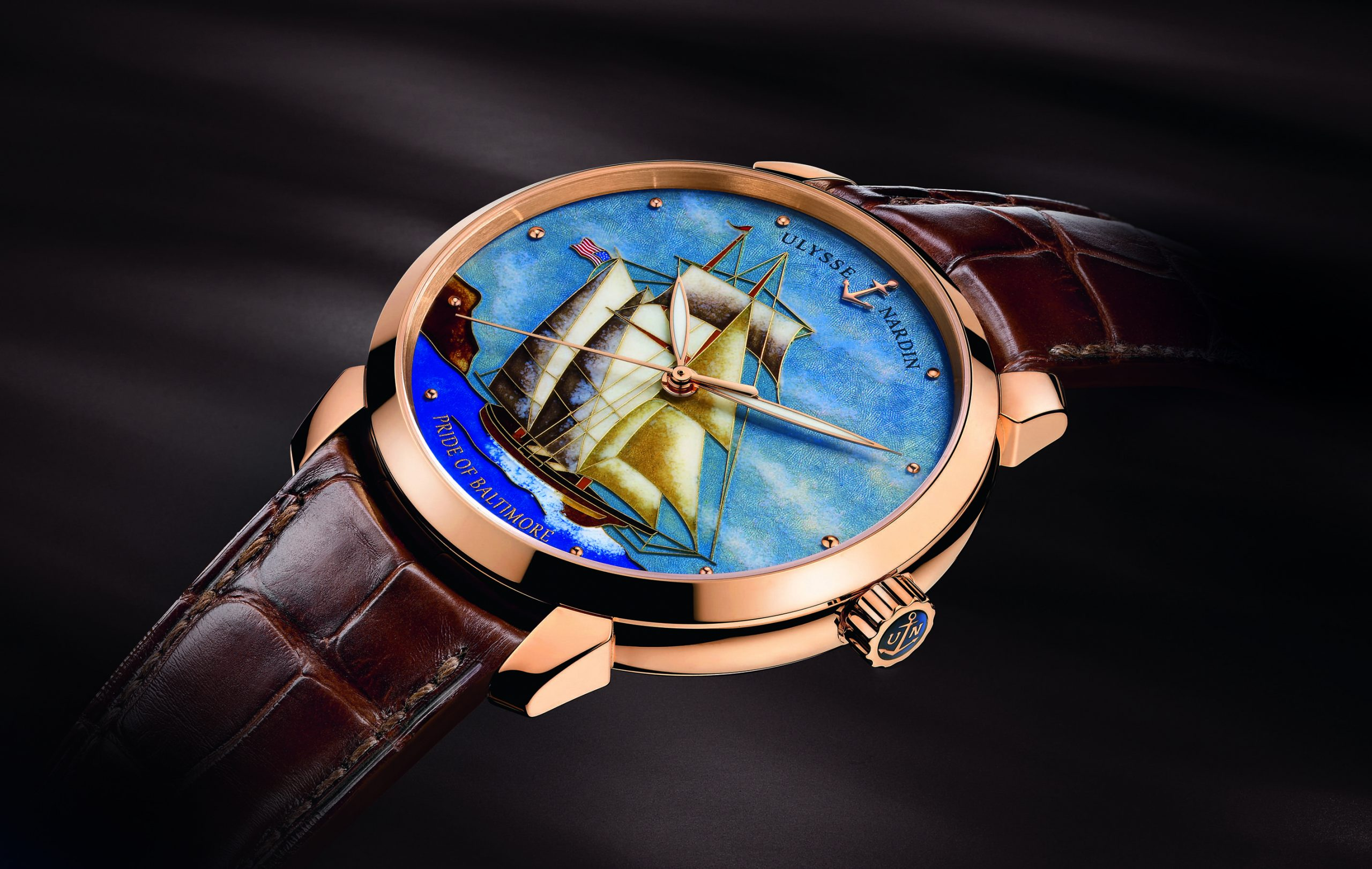 Exceptional Enameling Craftsmanship The design of the Pride of Baltimore is meticulously crafted, with the ship's detailed depiction achieved through the art of cloisonné enameling. This intricate technique involves dividing the dial into segments using fine gold wire, preventing the enamel from mixing. The process, which requires 50 hours of labor and 26 steps, results in a stunning visual representation of the ship cutting through the sea.
