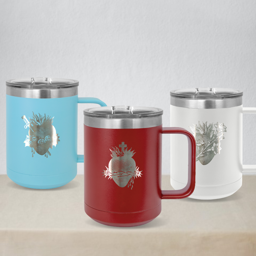 | As the leaves change colors and the autumn air chills down, we at Coraggio are thrilled to release our latest tumbler line honoring the three hearts of the Holy Family. Need a coffee mug with a lid for work? For school? To sip a hot drink the morning after camping? Look no further! Each of our travel mugs is a 15oz insulated tumbler with handle. These double-wall vacuum insulated mugs are twice as heat and cold resistant than normal tumblers and feature a clear lid. Standing 5" tall, with a 3" wide base, all our tumblers are hand-engraved as they are ordered right here in our Steubenville workshop. | | |