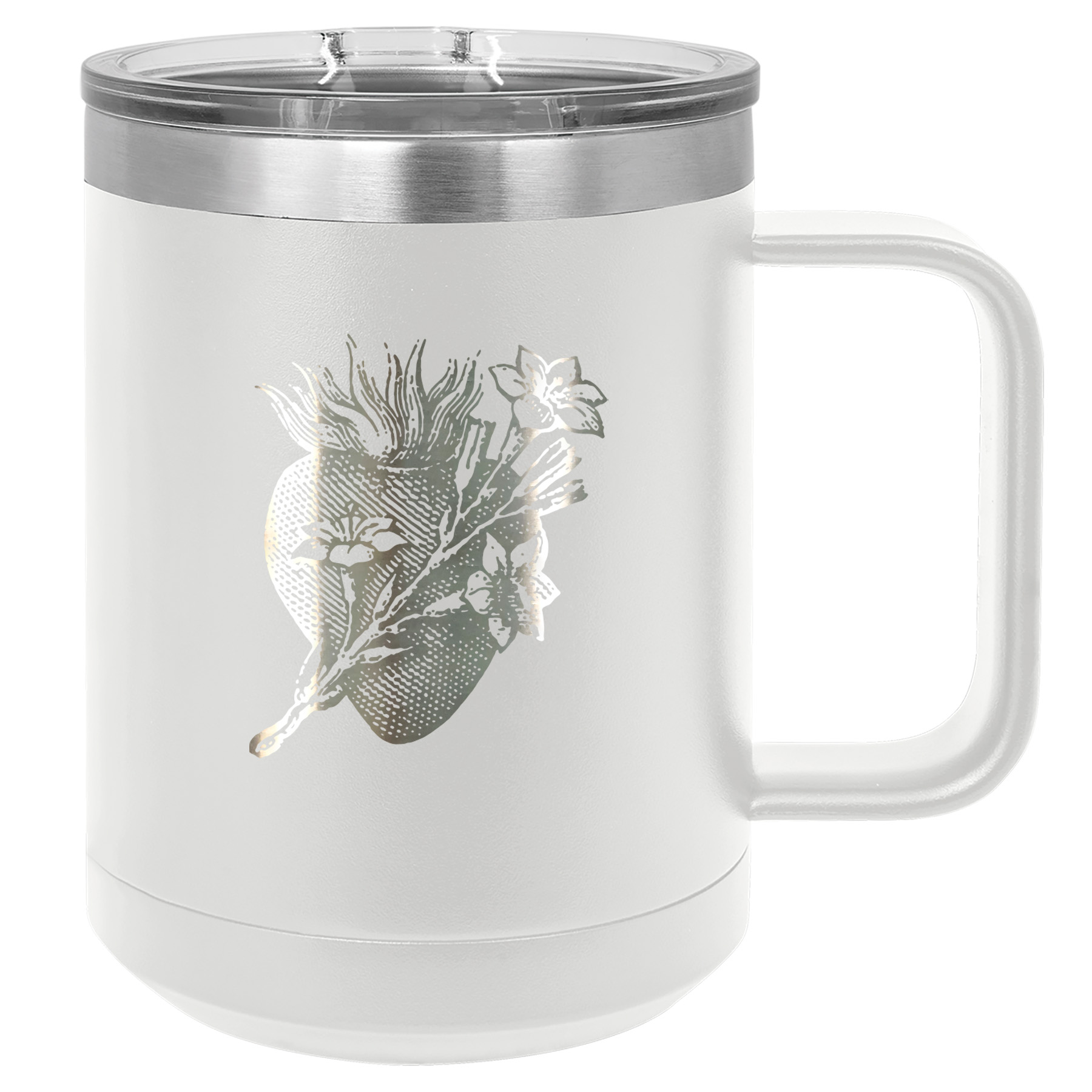 | Chaste Heart 15oz Travel Mug | True to the chaste heart of St. Joseph, this white travel mug depicts the heart of the foster father of Jesus accompanied by a lily, the timeless symbol for the Patron of the Universal Church | |