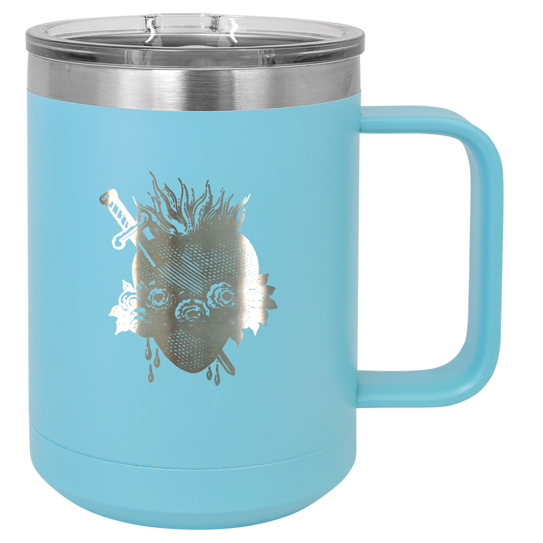 | Immaculate Heart 15oz Travel Mug | Inspiring devotion to Mary, her heart surrounded by roses and pierced with a sword is engraved on this light blue Marian tumbler | |