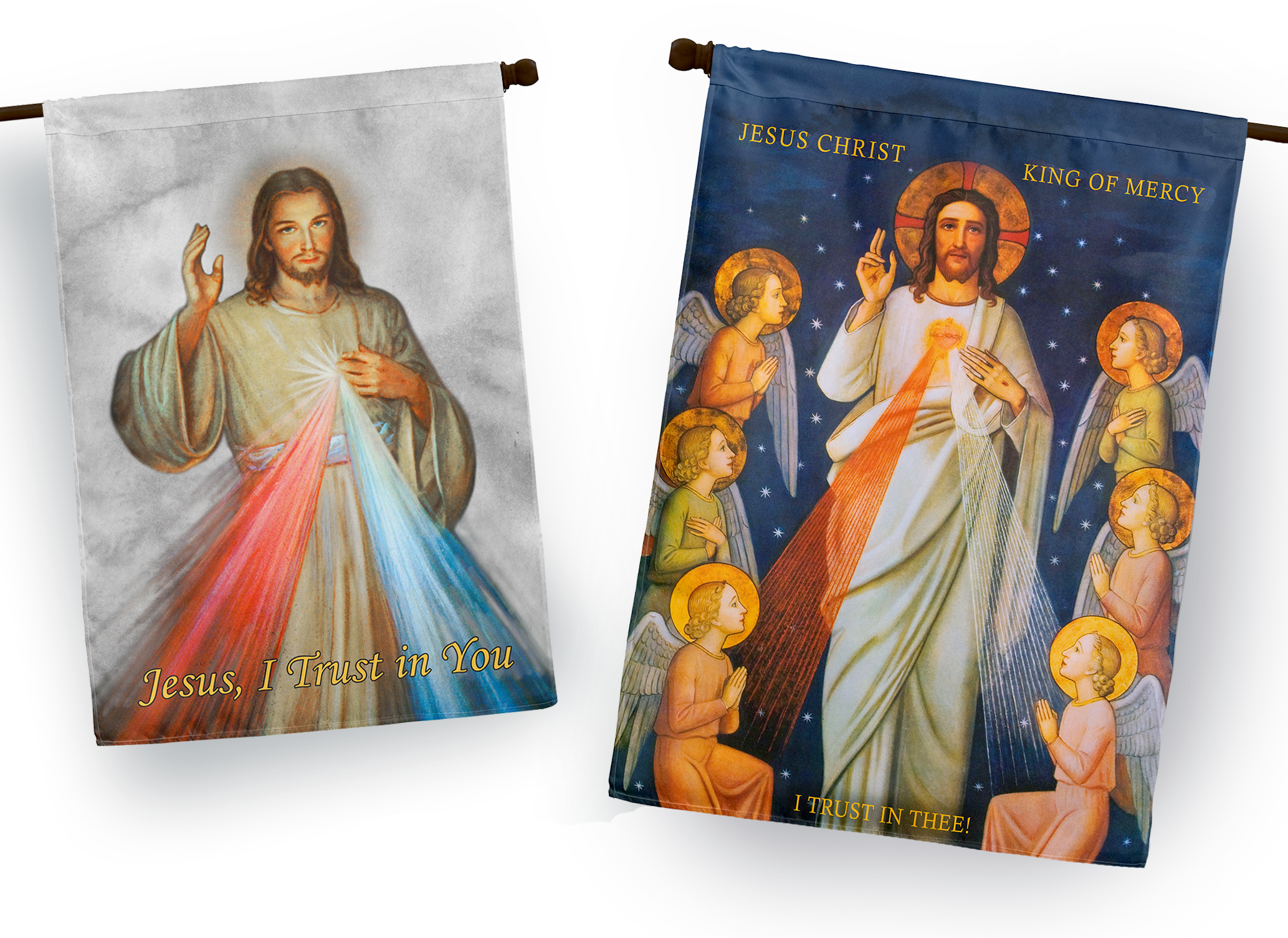 Each flag is 28"x 40" made of 150 denier woven polyester and double-stitched around the edges for durability. The polyester fabric can withstand high winds and is more fade-resistant than typical cotton house and garden flags. With a sleeve that fits up to a 2.5" diameter pole, proudly display the faith outside your home with our grand selection of Catholic art and images. |