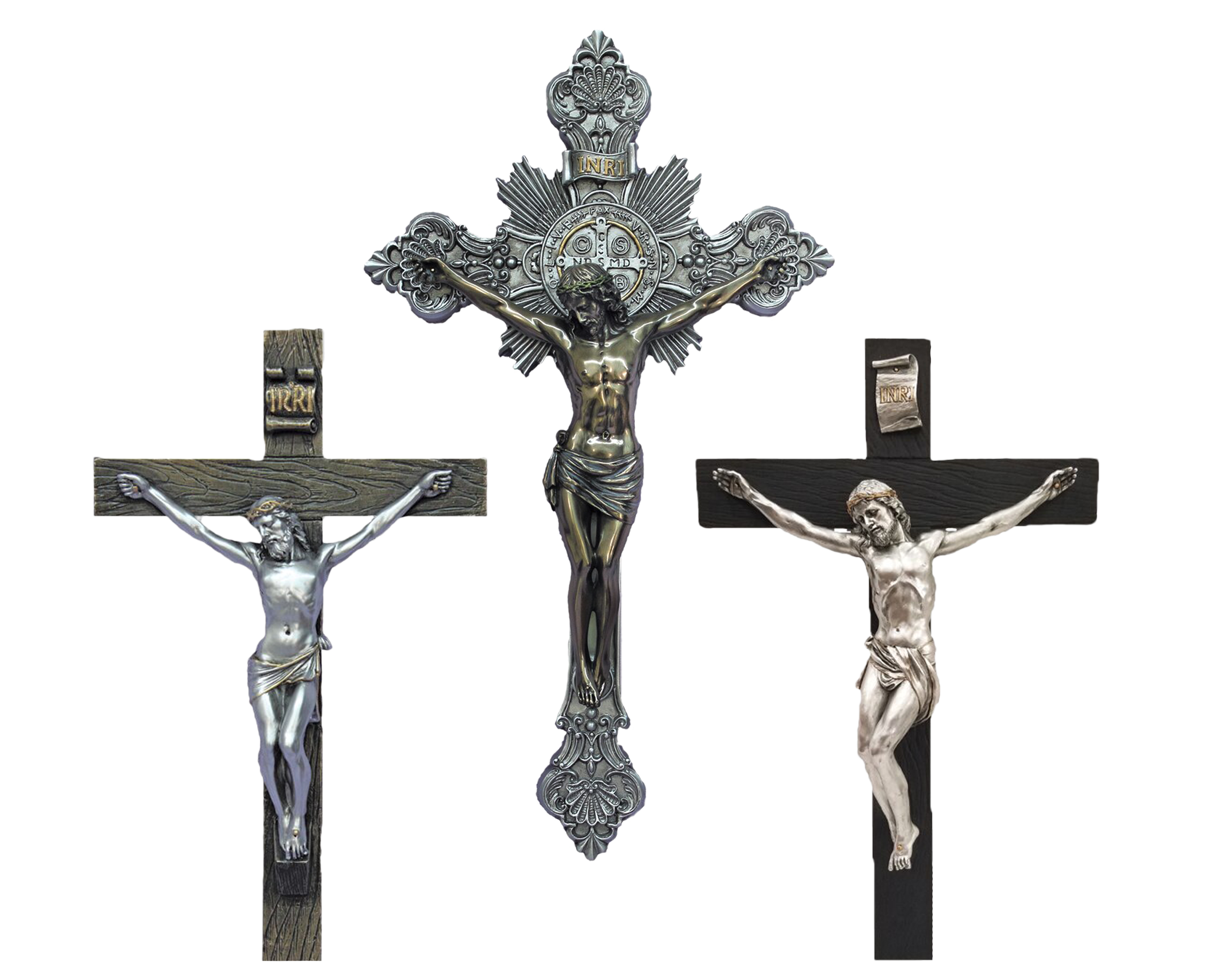 Catholic Veronese Crucifixes Introducing our newest addition to the Veronese Collection - Catholic Crucifixes. Incredibly detailed and well-built, these timeless pieces are the perfect addition to any home, church, or school. Crafted from cold-cast bronze, these crucifixes give you the look and cold feel of real bronze, without breaking the bank. View our entire selection by clicking the button below! | | | Pewter-Style Benedictine Crucifix - 14" This Benedictine crucifix features a pewter-style look and includes the Benedictine medal behind Christ. Inscribed on the medal are the initials for the prayer of the Rite of Exorcism, and also the letters, C S P B, which stand for: Crux Sancti Patris Benedicti ("The Cross of [our] Holy Father Benedict"). | | | Pewter-Style Double-Sided Standing Crucifix - 12.5" This 12.5" standing crucifix is double-sided, making it great to view from any angle. It features a pewter-style corpus with gold highlights, and INRI inscribed above Jesus. | | | Pewter-Style Crucifix - 10" This 10" crucifix features Christ in a pewter-style look with gold highlights. Nailed to a wooden style cross, it includes the letters, I N R I, which stand for: Iesus Nazarenus Rex Iudaeorum ("Jesus of Nazareth, King of the Jews"). This simple but elegant crucifix is the perfect addition to any room. | | | Bronze San Damiano Crucifix This cold cast bronze San Damiano crucifix is available in both 10" and 15.75" sizes. The San Damiano cross is especially significant to the life of St. Francis; it is from it that he miraculously heard God say, "Go repair my Church". The cross features a strong and confident crucified Christ, the Ascension above him, a company of angels looking in awe upon His sacrifice, Mary and St. John at His feet, Saint Mary Cleophas, Mary Magdalene, and Cleophas to His right. | | | Pewter-Style Standing/Hanging Crucifix - 13" This 13" crucifix features Christ crucified on a cross staked into a boulder. Featuring a pewter-style look with gold highlights, this crucifix is able to be free standing or hung up on your wall with a hook located on the back. | | | |