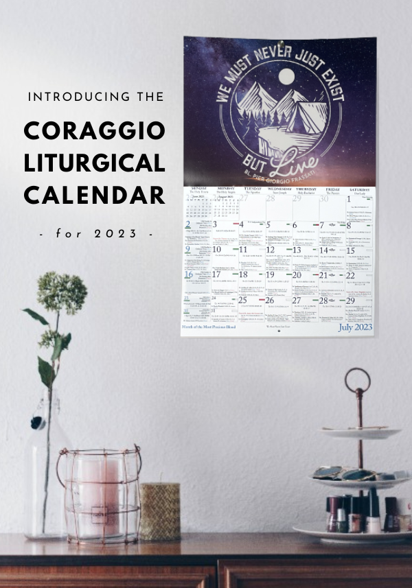 | Have you ever wanted to incorporate your faith more into your every day? Have you ever thought about living according to all of the Church seasons and feasts, not just the Holy Days of Obligation? | Our beautiful and unique Catholic liturgical calendar showcases inspiring Coraggio designs. Each month features a different image or quote, encouraging you on your Catholic adventure! Every month of the calendar features: Daily liturgical readings The liturgical season New and traditional Catholic feast days Days of prescribed fasting and abstinence Holy Days Secular holidays The monthly Church devotion And an inspiring design to reflect on throughout the month!