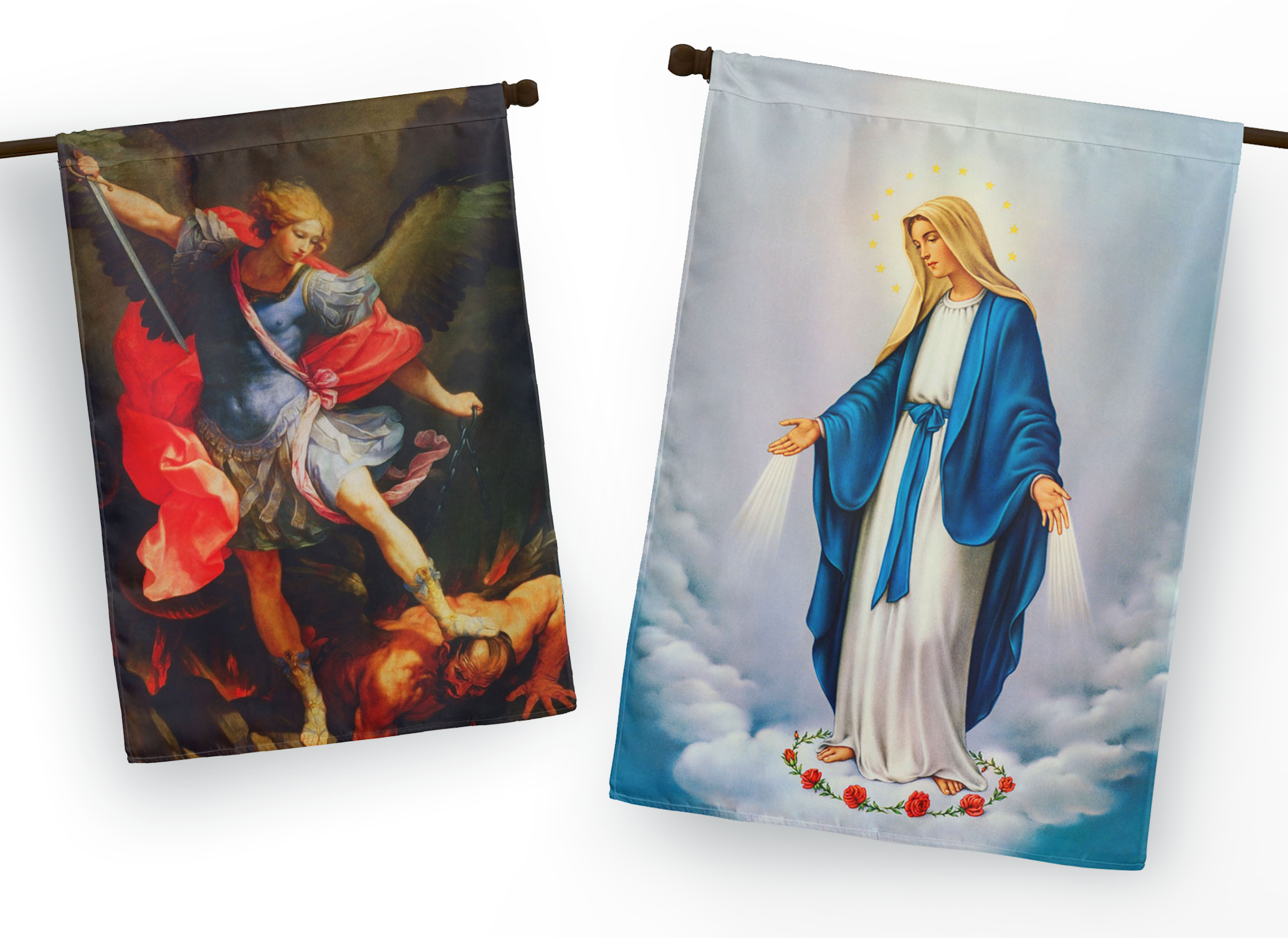 Each flag is 28"x 40" made of 150 denier woven polyester and double-stitched around the edges for durability. The polyester fabric can withstand high winds and is more fade-resistant than typical cotton house and garden flags. With a sleeve that fits up to a 2.5" diameter pole, proudly display the faith outside your home with our grand selection of Catholic art and images. |