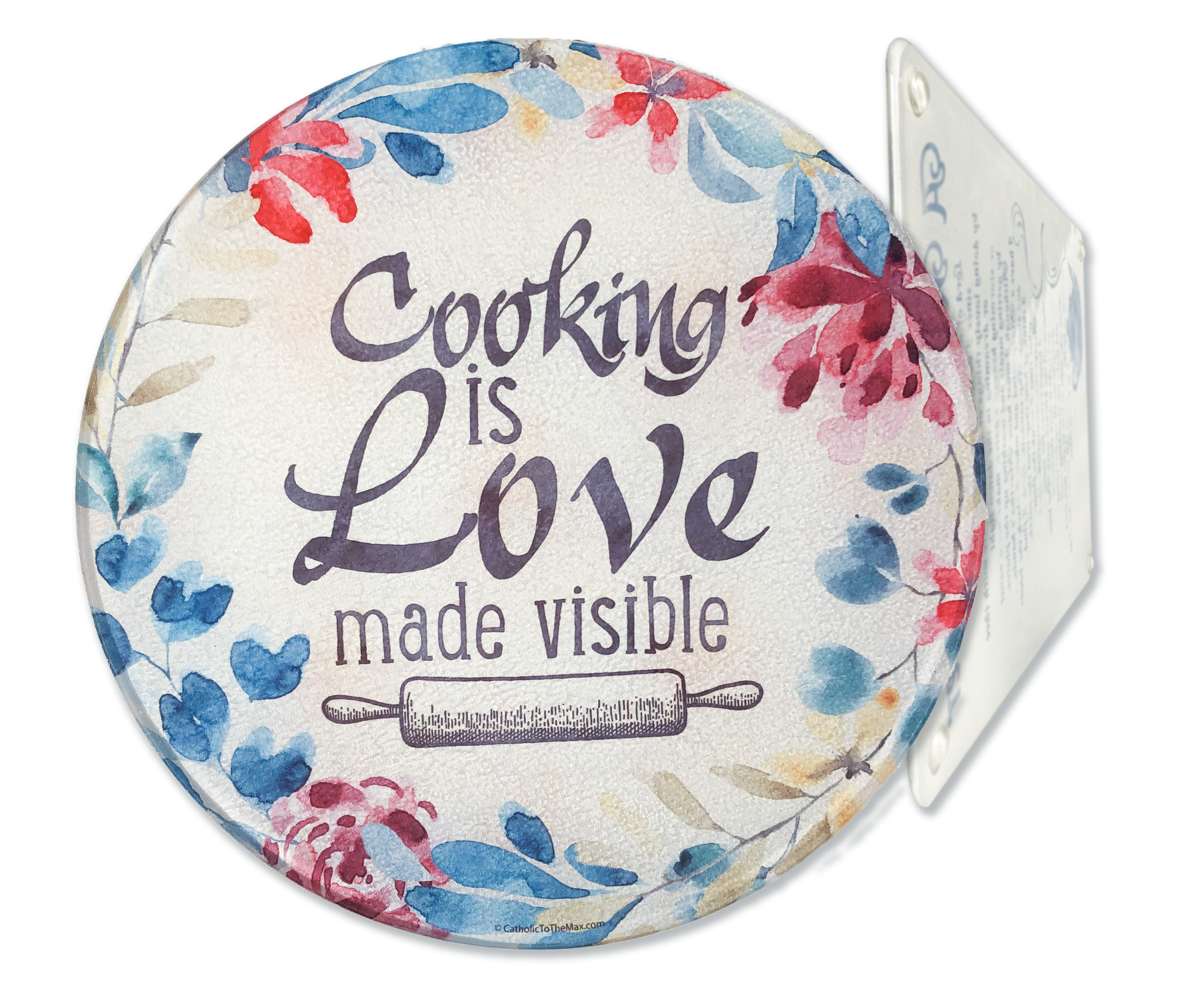 Our Catholic cutting boards are made from tempered glass: durable, easy to clean, and more sanitary than wood or plastic. They come with rubber feet for stability and to provide airflow underneath, protecting your counter or table from heat, condensation, and scratching. Making beautiful serving trays that can double as a counter protector or trivet, they are 100% USA made and dishwasher safe.