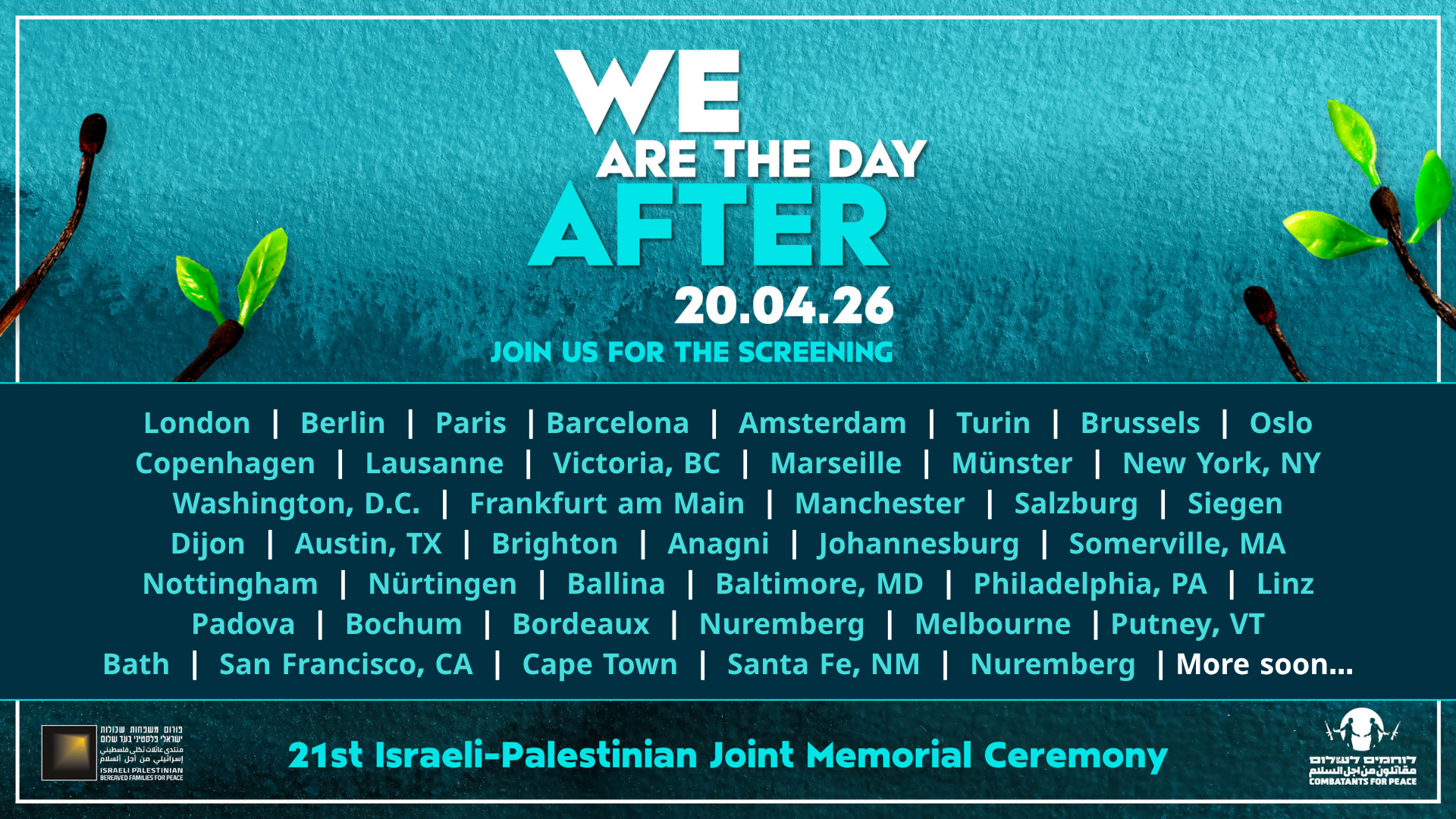 There is nothing more important than community in peacebuilding, and you can be part of something meaningful from wherever you are. The Israeli–Palestinian Joint Memorial Ceremony, organized together with the Parents Circle – Families Forum, will take place next week on April 20th. Screenings are being held in cities around the world, and you can register to join one near you. Click a city in the link below to find a screening and learn how to take part. |