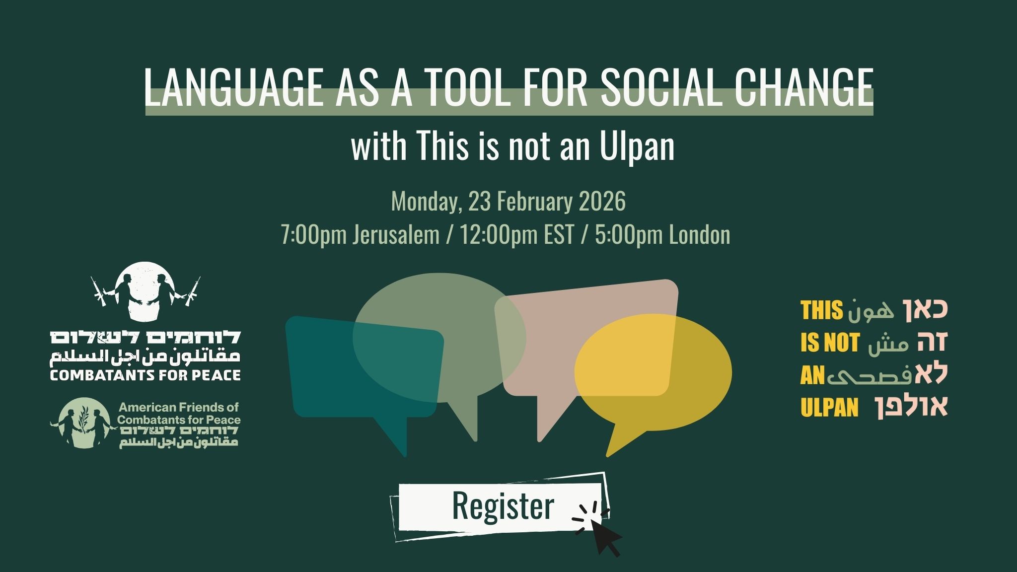 We are pleased to invite you to a special discussion on Language as a Tool for Social Change, in partnership with This is not an Ulpan, an alternative language school for Arabic and Hebrew learners, run by a non-profit cooperative of language teachers and students.