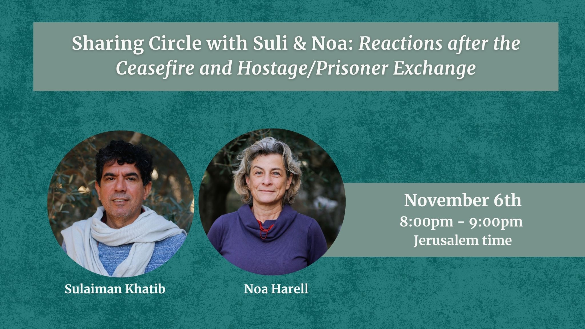 We will open the gathering with Noa and Sulaiman sharing how the ceasefire announcement has impacted Israeli and Palestinian communities here on the ground, and their reactions in recent days. Then, we will open up the conversation to hear from you, our global Friends community.