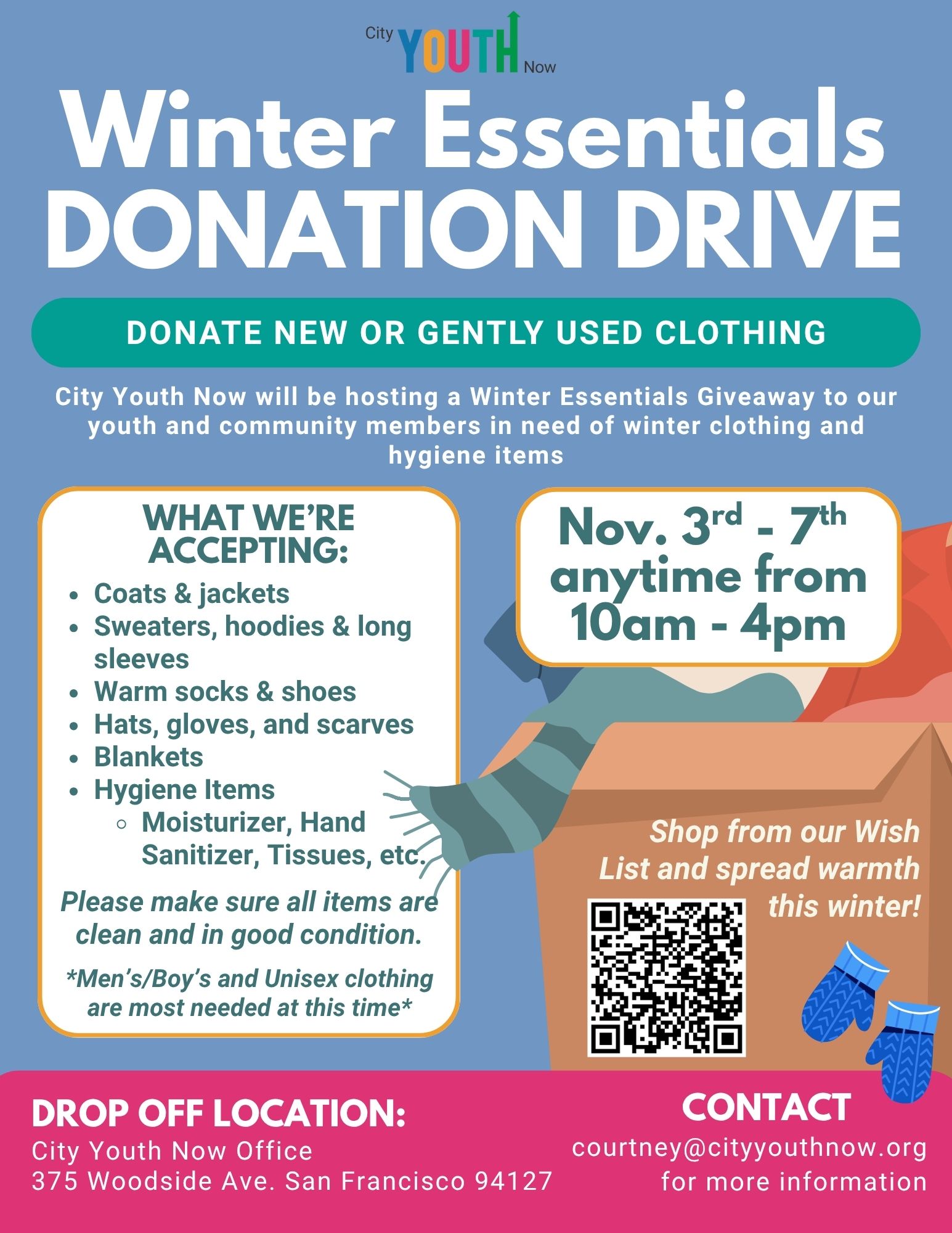 City Youth Now is excited to announce our Winter Essentials Donation Drive! 🧣🧦 In preparation for our Winter Essentials Giveaway the week of November 17th, we’re collecting extra clothing and essential items to support youth and families in our community.