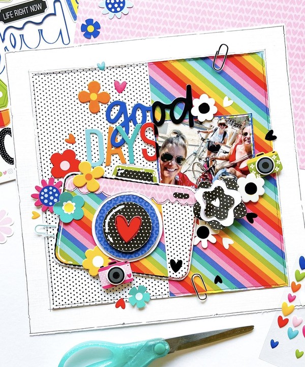 Gloria went horizontal with her half and half design. She used the Documented Cut-Outs and filled it with patterned paper. Then she added fun puffy stickers and small details to accent the Cut-Out. Be sure to check out Gloria's video below! |