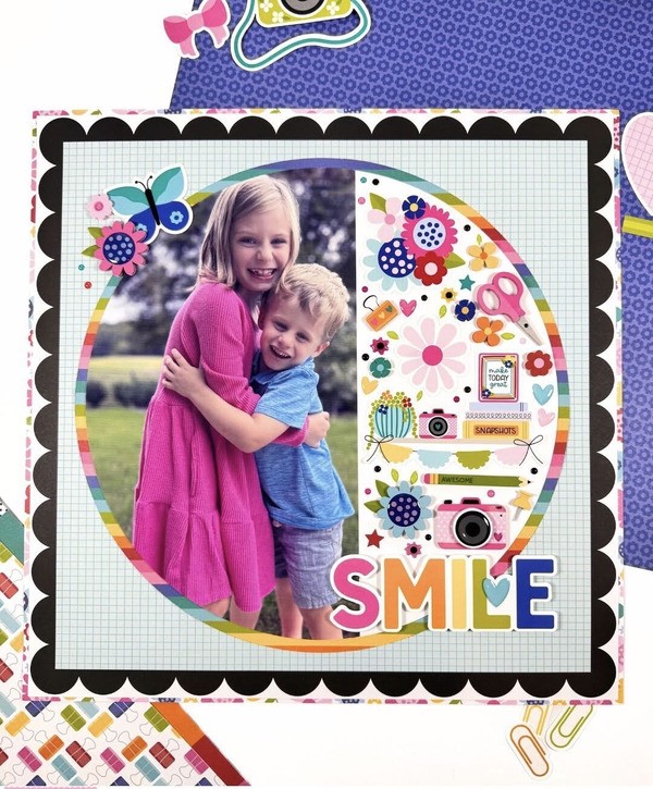 Traci used a simple shape for the focal point of her layout. She filled one half of her circle with a photo and the second half full of small details. Be sure to give this project a close look so you don't miss any details! |