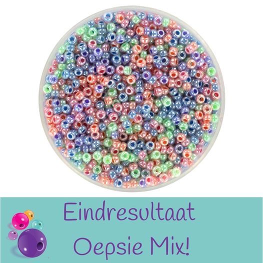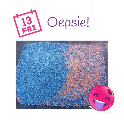 Bij ons worden er elke dag kilo's kraaltjes gewogen en verpakt in de juiste hoeveelheden. Hiervoor gebruiken we de weegmachine en dat gaat eigenlijk altijd goed... maar soms gaat het toch net mis en laat het dan net vrijdag de 13e geweest zijn. :) Soms zijn we zo vlot bezig dat er 2 verschillende kleuren in de weegmachine worden gegooid! En die moeten we er dan natuurlijk weer uithalen. Maar geen enkele kraal gaat bij ons verloren, dus dan maken we er weer een leuke mix van. En die noemen we 'Oeps mix'. Hier zie je de 2 ceylon kleurtjes die per ongeluk bovenop elkaar kwamen te liggen en daarbij zie je de mix, die we met de hulp van reacties op Facebook hebben gemaakt. |