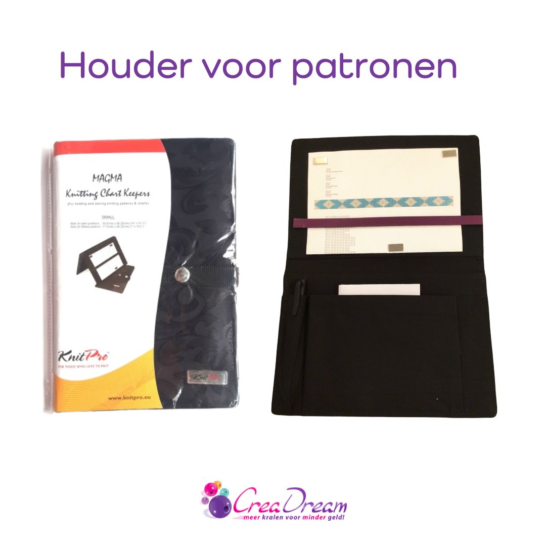| Deze map is ideaal wanneer je iets maakt met een patroon, want hiermee kun je het patroon handig rechtop zetten. Door de band aan de voorkant kun je ook je papier steeds een stukje aantrekken, waardoor de juiste regel precies hierboven zit en makkelijk te lezen is. Aan de achterkant is ook een vak waar je je naalden, pennen, kraaltjes in kunt doen. Zo kun je het ook heel makkelijk op reis of een dagje uit meenemen. |