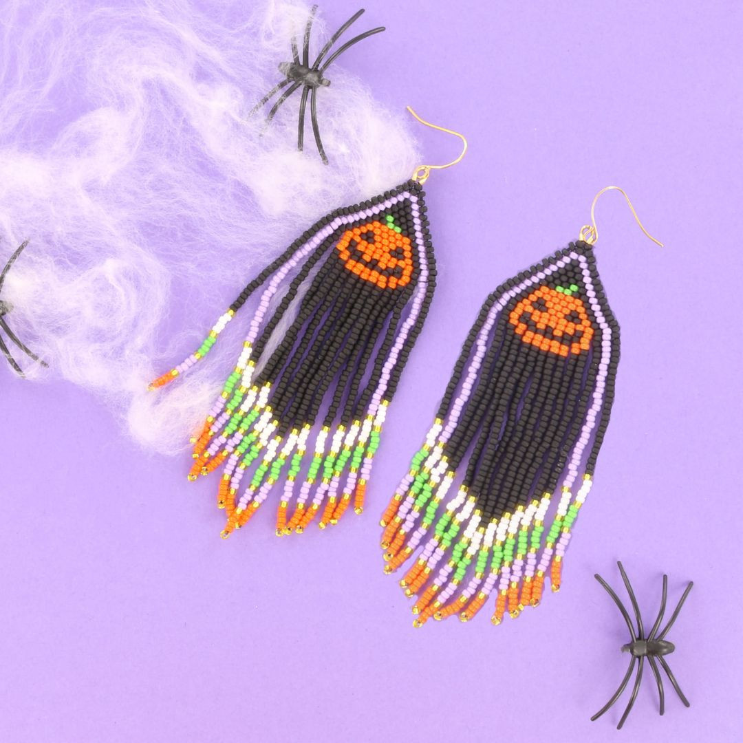 π Fringe oorbellen zijn ontzettend leuk om te maken en geven je Halloween outfit een extra feestelijke uitstraling! π Begin met een rijtje ladderstitch, waarop je vervolgens de brick stitch kunt toepassen. π Tot slot rijg je de fringes eraan. π Wil je stap voor stap leren hoe je deze oorbellen met een leuk Halloween patroon kunt maken? π Lees dan zeker de blog door. π Je kunt ook een compleet pakket bestellen, zodat je direct alle benodigde kralen en materialen in huis hebt. π |