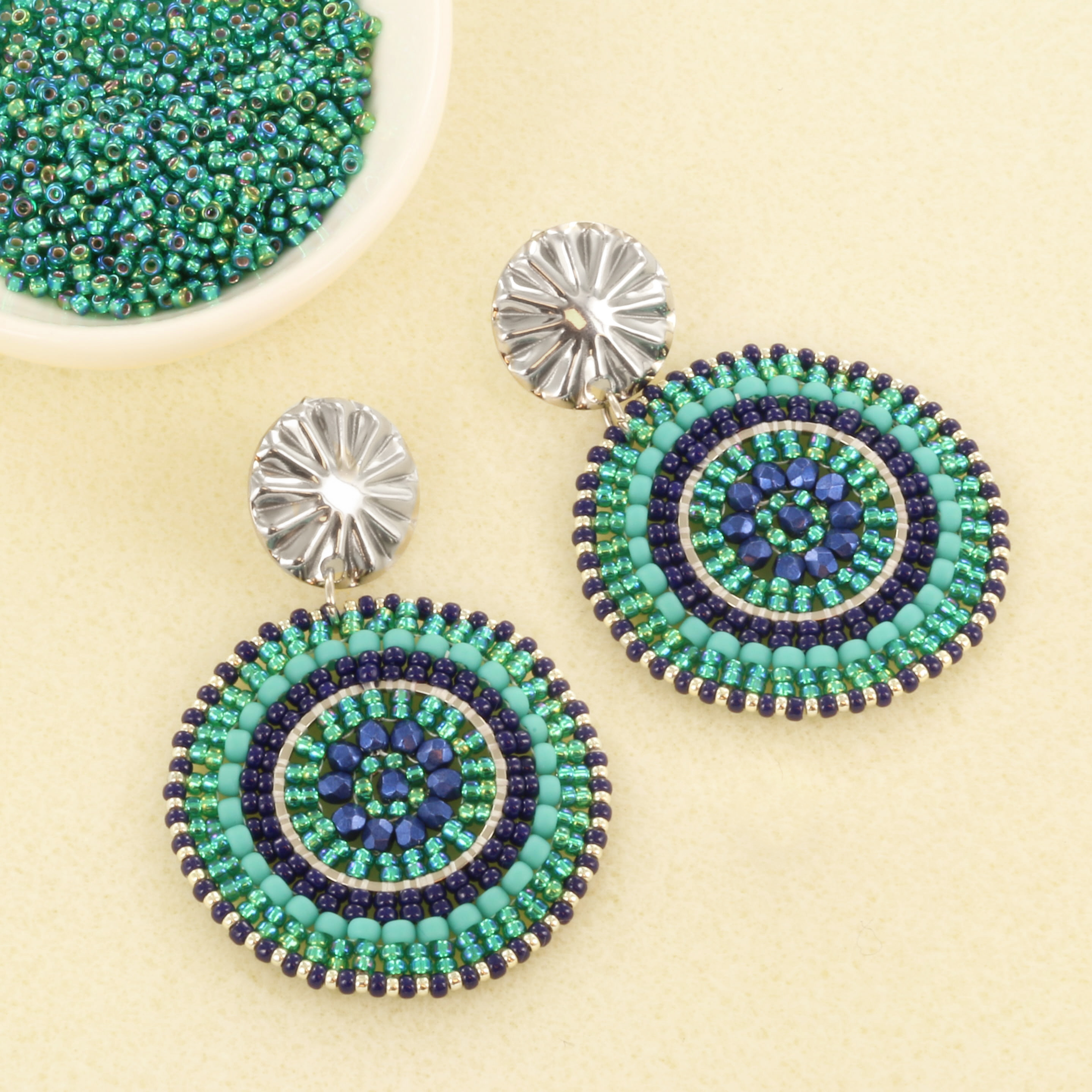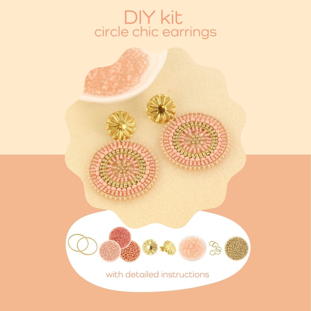 We've also added two beautiful new colors to our DIY kits for circle chic earrings: emerald blue and salmon gold. All the necessary beads and hardware are included, along with detailed instructions for making these earrings. The earrings are approximately 4 cm in diameter.