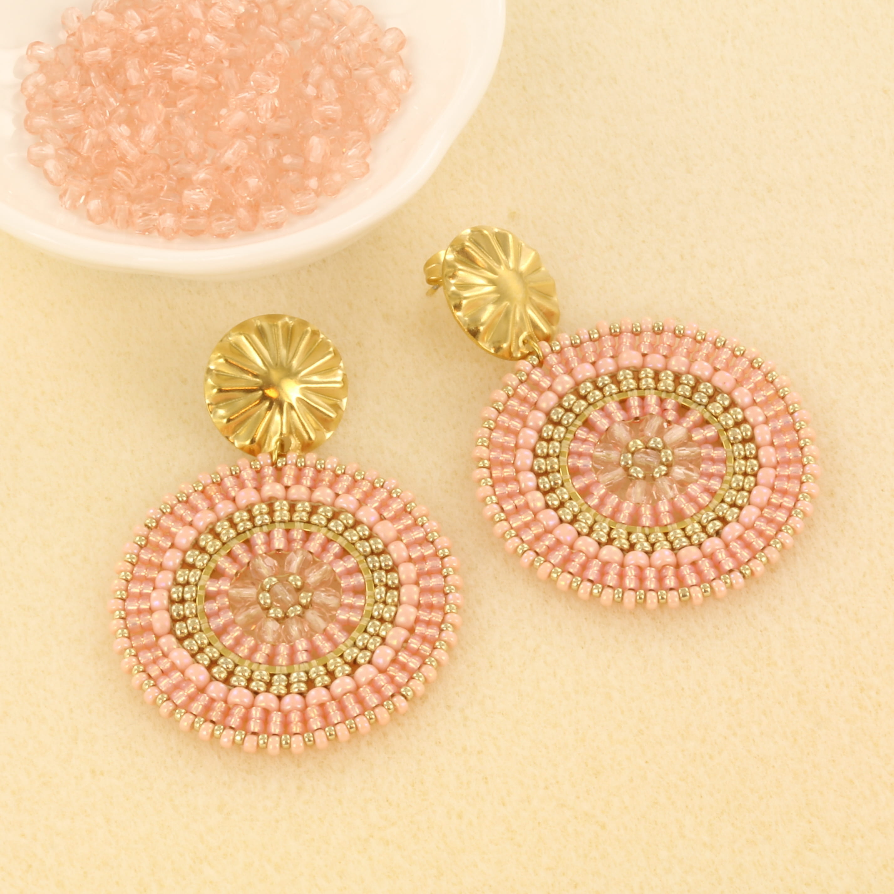 Ook hebben we twee prachtige nieuwe kleuren toegevoegd aan onze DIY kits voor circle chic oorbellen. Namelijk emerald blauw en zalm goud. Alle benodigde kralen en onderdelen zijn inbegrepen, samen met gedetailleerde instructies voor het maken van deze oorbellen. De oorbellen hebben een diameter van ongeveer 4 cm.