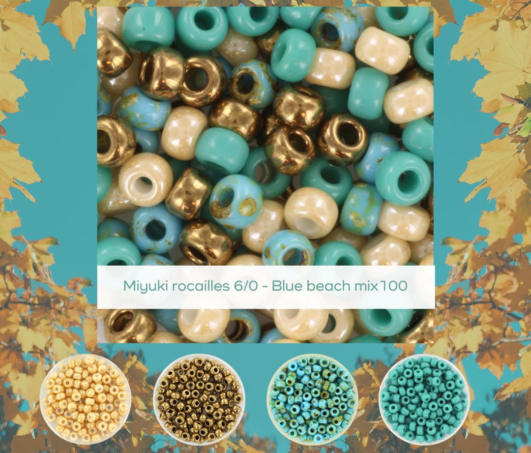 De nieuwe Blue Beach mix met Miyuki 6/0 kralen bestaat uit frisse tinten van turquoise, beige, brons en Picasso. Deze mix is een variant op de populaire Blue Beach-mix met Miyuki 8/0 kralen.