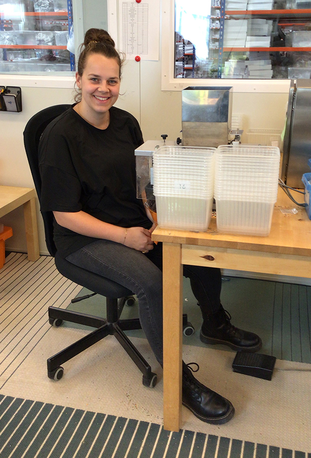 | Hiernaast zie je Dion achter de weegmachine. Bovenin gooien we de zak of zakken kralen en omdat de trilplaat gaat bewegen, stuiteren de kraaltjes naar voren. En wanneer er 5 of 10 gram is bereikt, stopt het trillen. Zodra dan de pedaal beneden ingedrukt wordt, worden de kraaltjes in de trechter gestort, waaronder we het zakje klaar hebben hangen. Op deze manier kunnen we maar liefst 8 ร  10 zakjes per minuut wegen en dat is ook wel nodig, want door jullie bestellingen zouden we het anders nooit redden! |