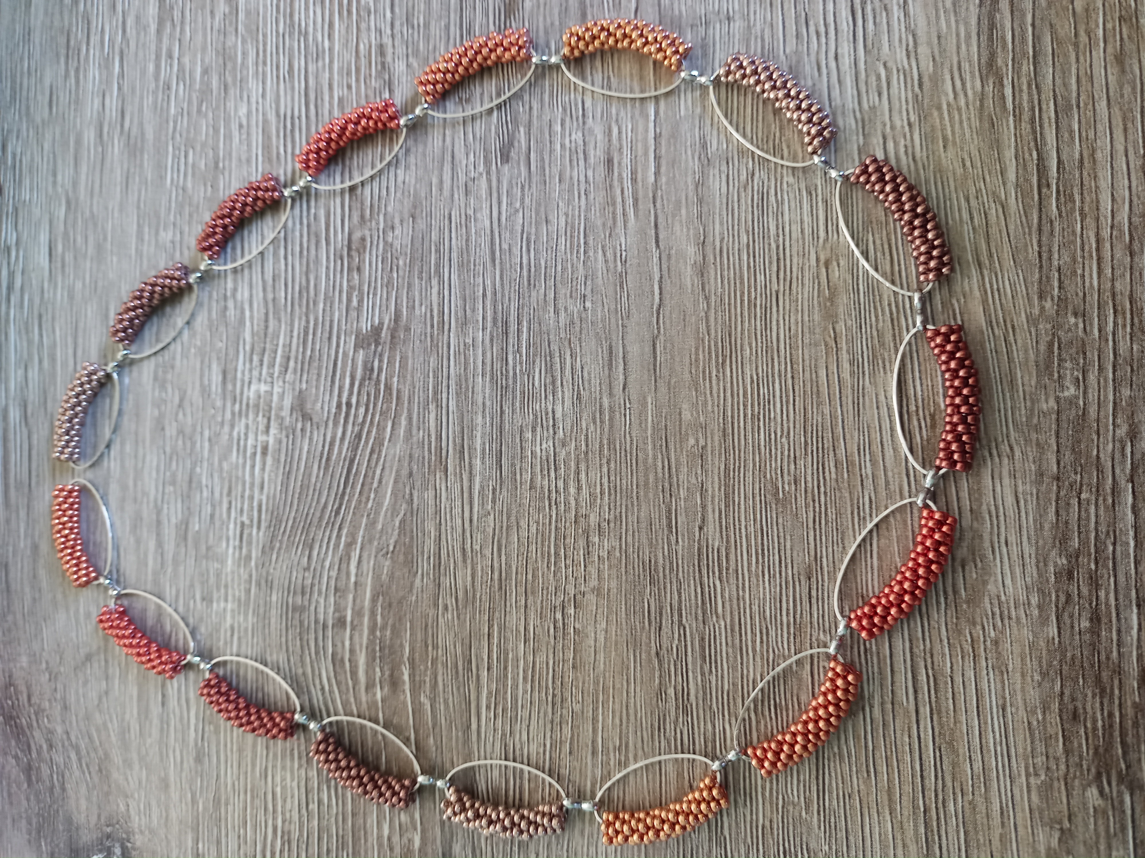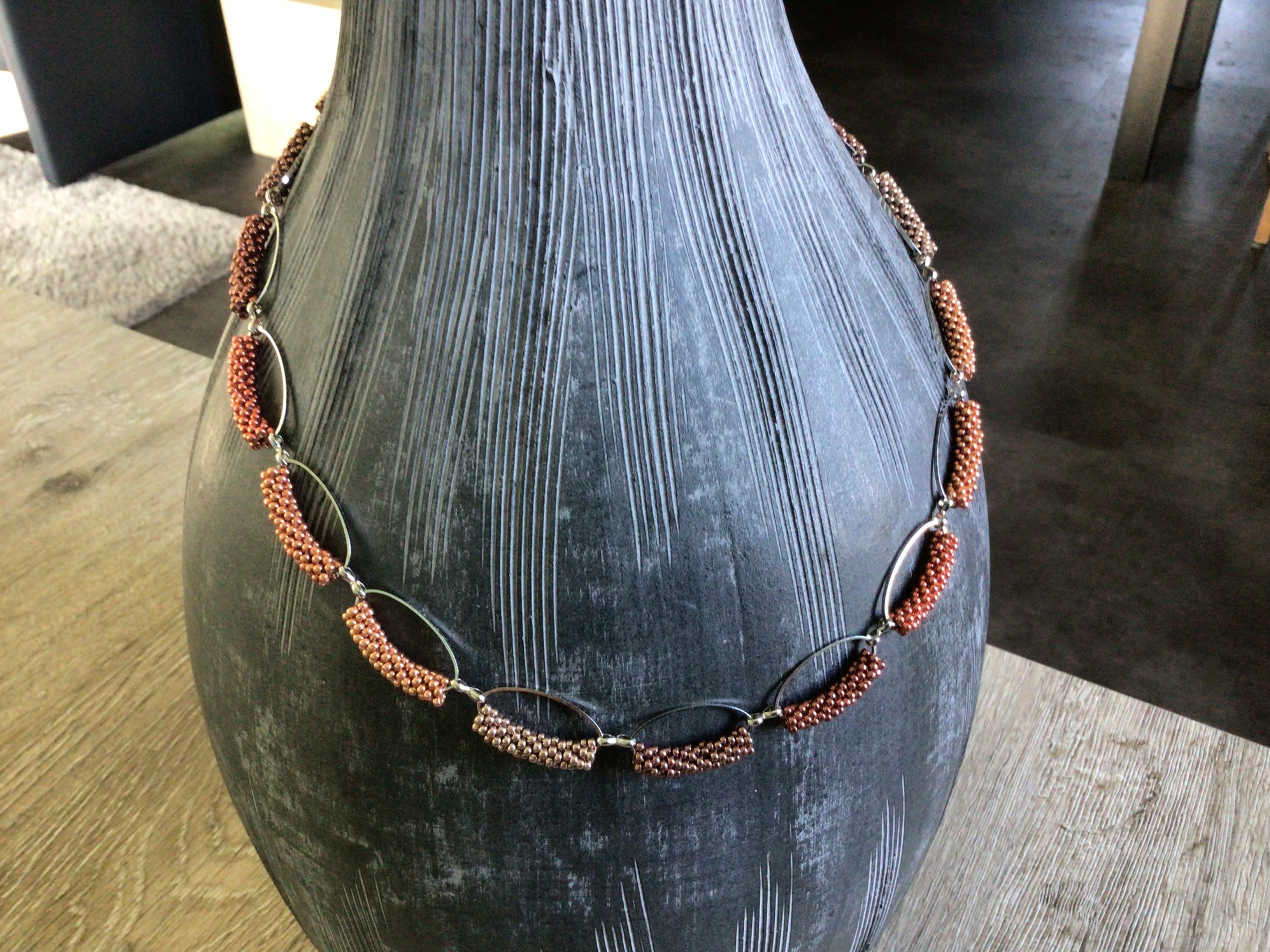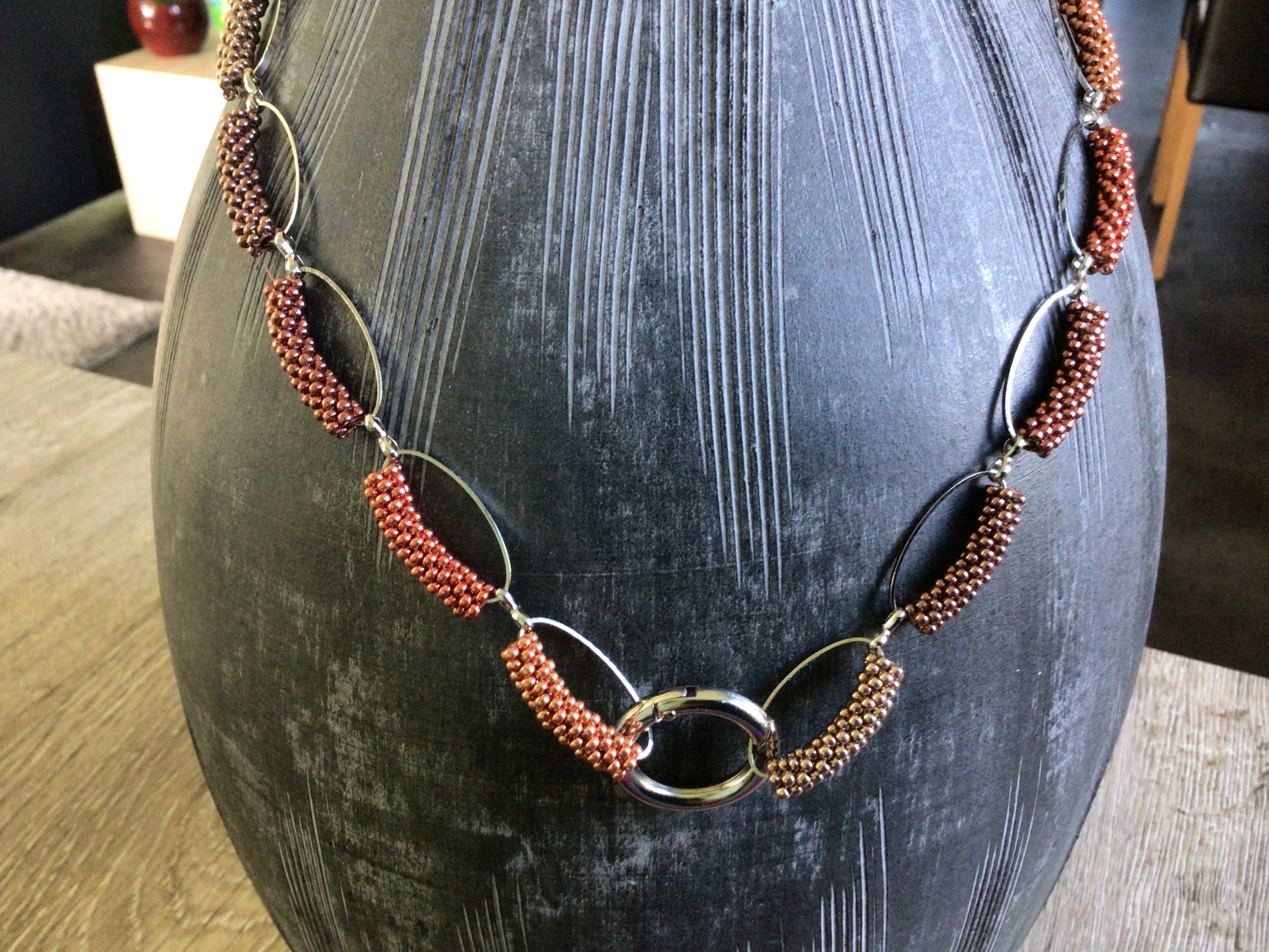 De ketting is gemaakt met rocailles 11/0 en een grove schakelketting. De kralen zijn door middel van de peyote rijgtechniek om de schakels heen gemaakt. Daarbij is gebruik gemaakt van een mooi kleurverloop van de duracoat galvanized kralen.