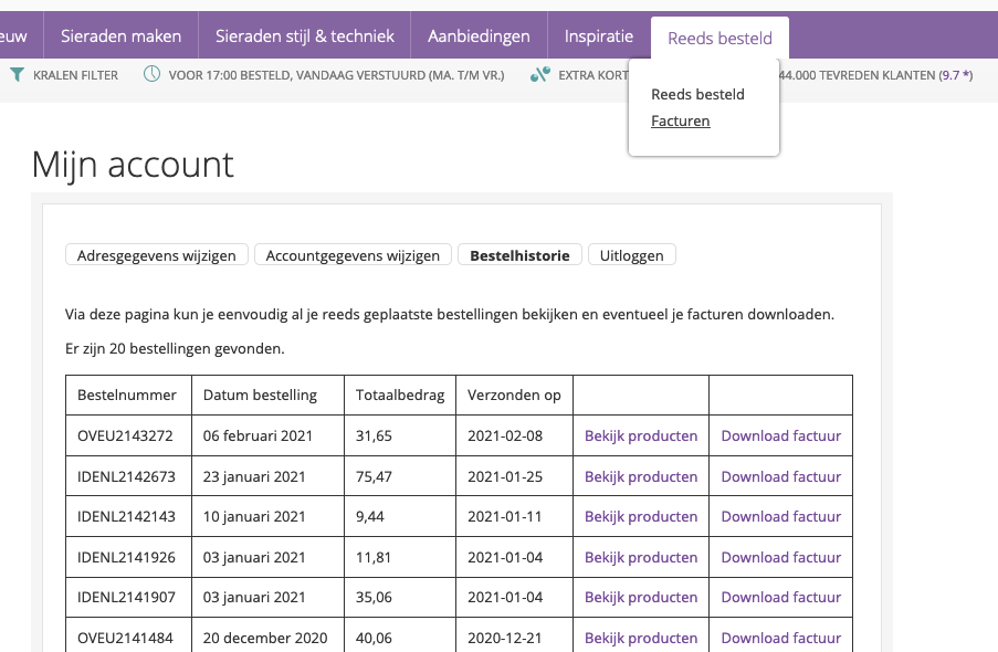 | In je account hebben we nu een pagina toegevoegd, waar je al je facturen kunt inzien. En het leuke hierbij is, dat je ook op je bestelling kunt klikken om alle artikelen op de site terug te zien. Heel makkelijk als je net weer iets uit moet zoeken. En wat ook mooi is, is dat het niet uitmaakt hoe lang geleden je je bestelling hebt geplaatst. De facturen gaan terug tot het vroege begin, dus heb je bijvoorbeeld in 2016 besteld, ze staan er ook gewoon bij. |