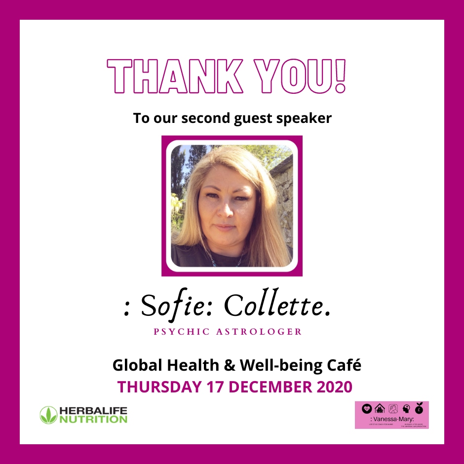 Greetings Friend,I hope you've had another fantastic week! The month of December seems to be rushing past so quickly. Where is the time going? The new year in the Roman Calendar will nearly be with us. Thursday evening was the second virtual Global Health & Well-being Café. The online session was very well attended. Thank you to all of the beautiful souls who tuned in to be on the call. If you were on the livestream with us Friend it was a pleasure to be in your company. I hope you enjoyed the event. If you heard one thing on Thursday evening that will make a difference to your life, that's great! |