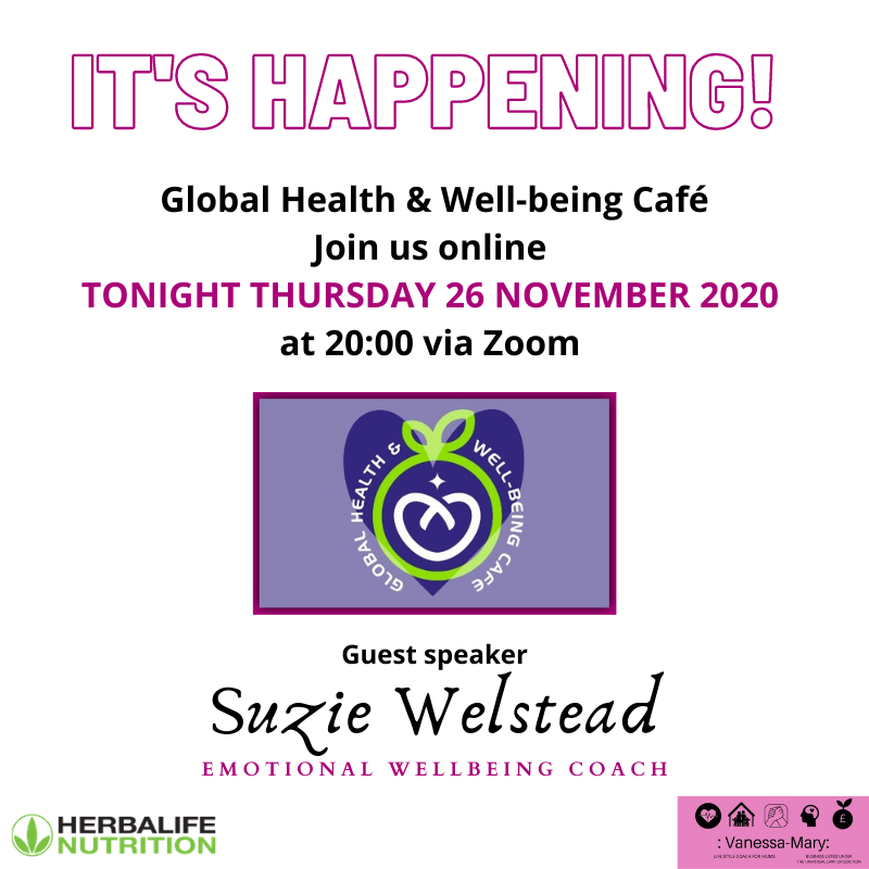 Greetings,How are you? I hope you've had a good week. I'm so excited. The clock is ticking now. The relaunch of my event taking place TONIGHT - Thursday 26 November 2020 at 20:00 Staying connecting during these times is good for your mind, emotions and soul. Boost your immunity, express your feelings, learn new things and network with other living souls in an informal, fun and informative online gathering. |