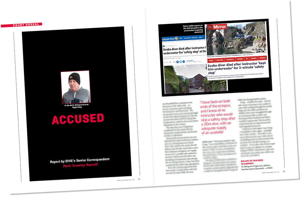In 2016, experienced instructor, Nigel Craig, was teaching a deep specialty course at Stoney Cove in the UK when, tragically, his student became unresponsive during the safety stop and later died. Four years later, Craig was informed he would be prosecuted for Gross Negligence Manslaughter, and for the next two years was put through a hell from which he has yet to recover. Mark ‘Crowley’ Russell explores why he should never have been put on trial, and why – had the scuba diving world been quicker to understand the dangers of Immersion Pulmonary Oedema – perhaps none of this would have happened.
